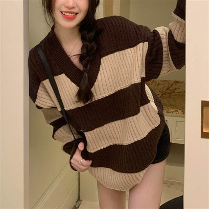 V领条纹撞色慵懒风毛衣女新款2024秋季设计感套头针织衫宽松上衣