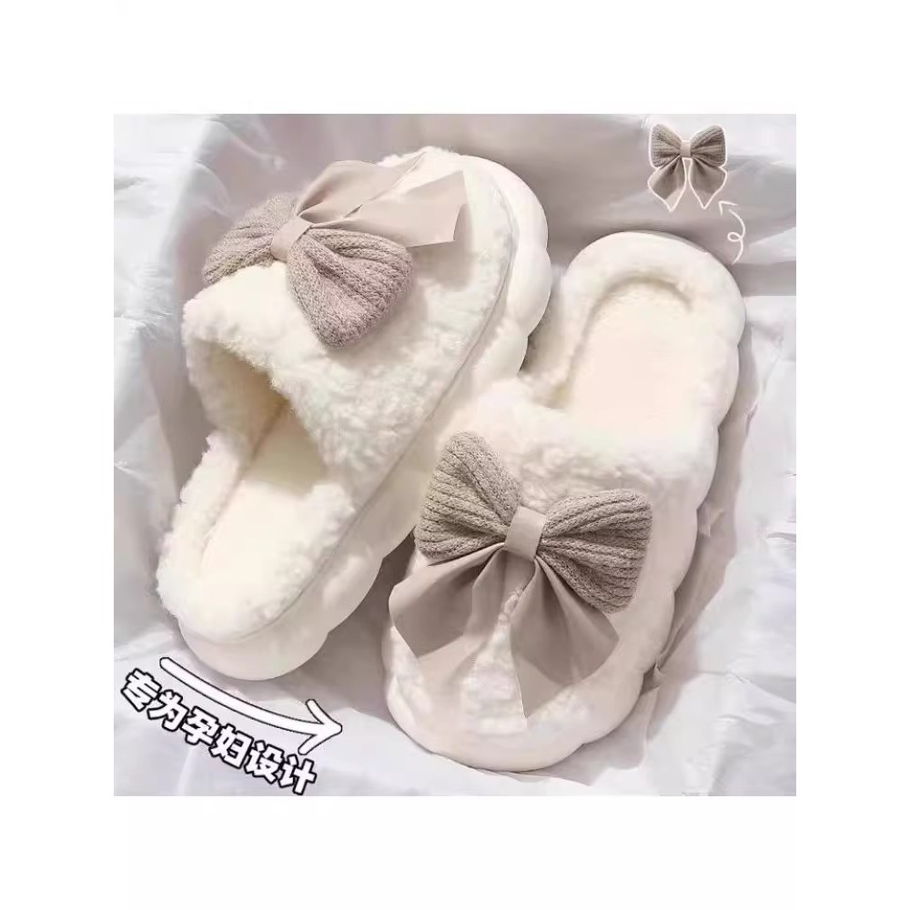 软萌云朵底蝴蝶结毛绒棉拖鞋厚底防滑保暖家居棉拖底月子鞋毛绒棉