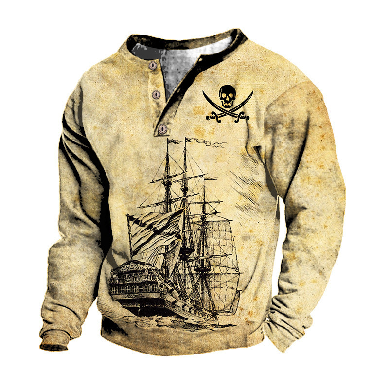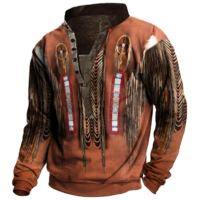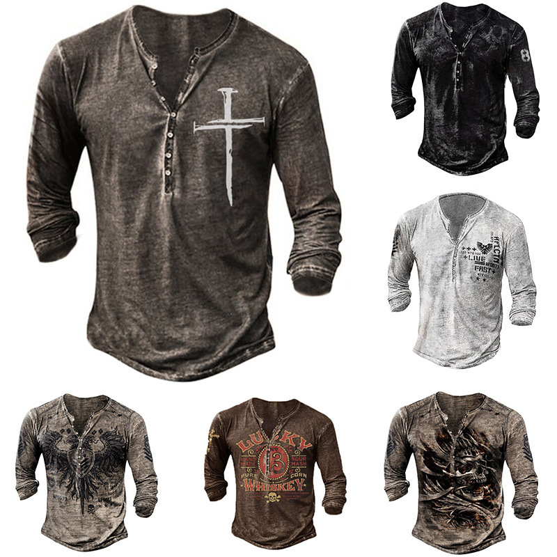 跨境复古民族风七粒扣亨利衫3D印花圆领长袖运动衫休闲男士打底衫