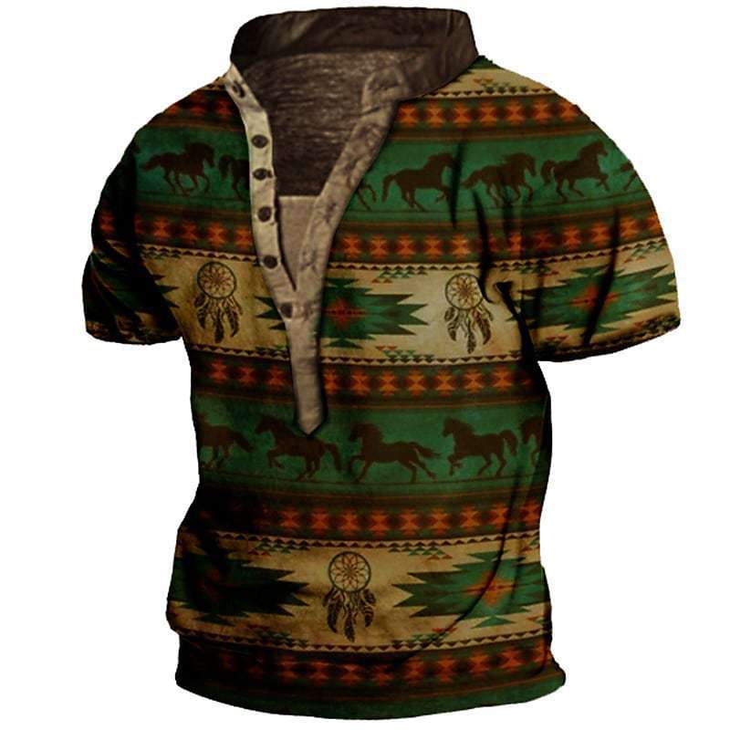 跨境独立站wish民族风男装夏季男士3D印花短袖T恤仿棉亨利衫