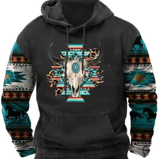亚马逊独立站3D印花跨境休闲连帽卫衣男装民族风连帽带绳卫衣