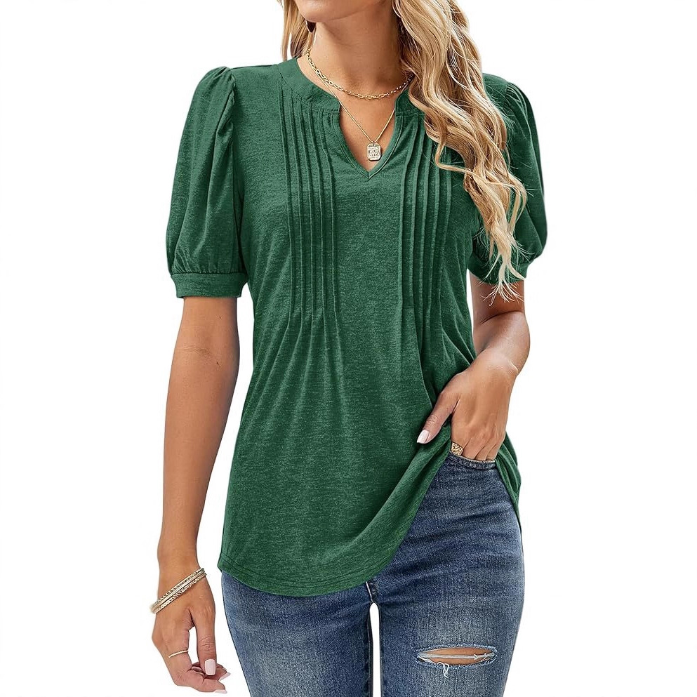 亚马逊爆款欧美女装V领泡泡短袖褶皱T恤女式休闲上衣