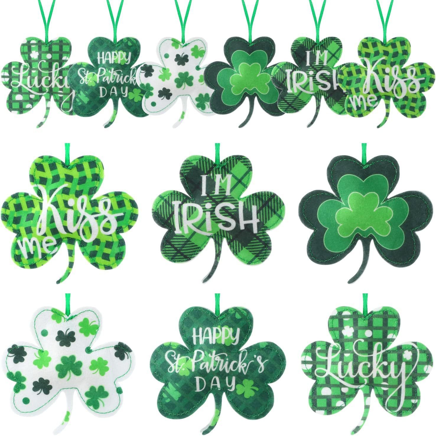 跨境新品8件复古圣帕特里克节绿色格子三叶草木制悬挂装饰