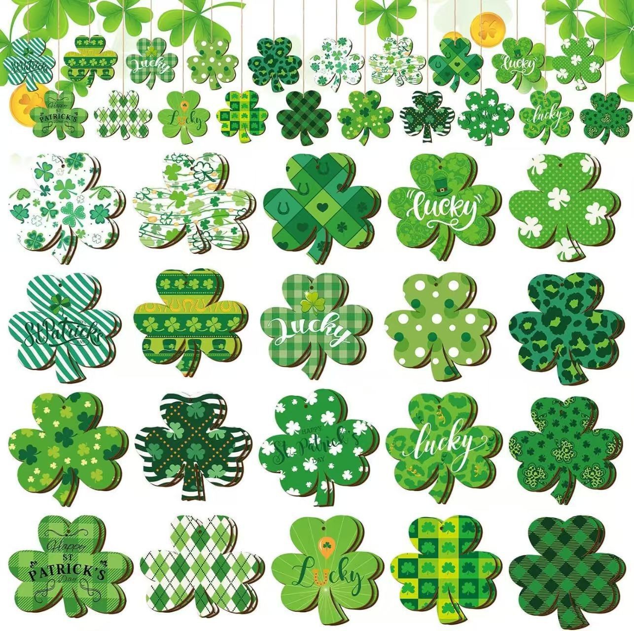 圣帕特里克节2D平面木质幸运草木质挂饰圣帕特里克节三叶草装饰品