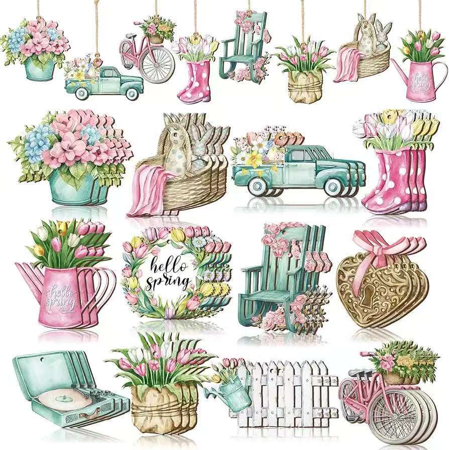 跨境新品24件春季木复活节制悬挂装饰创意2d平面木制节日派对装饰