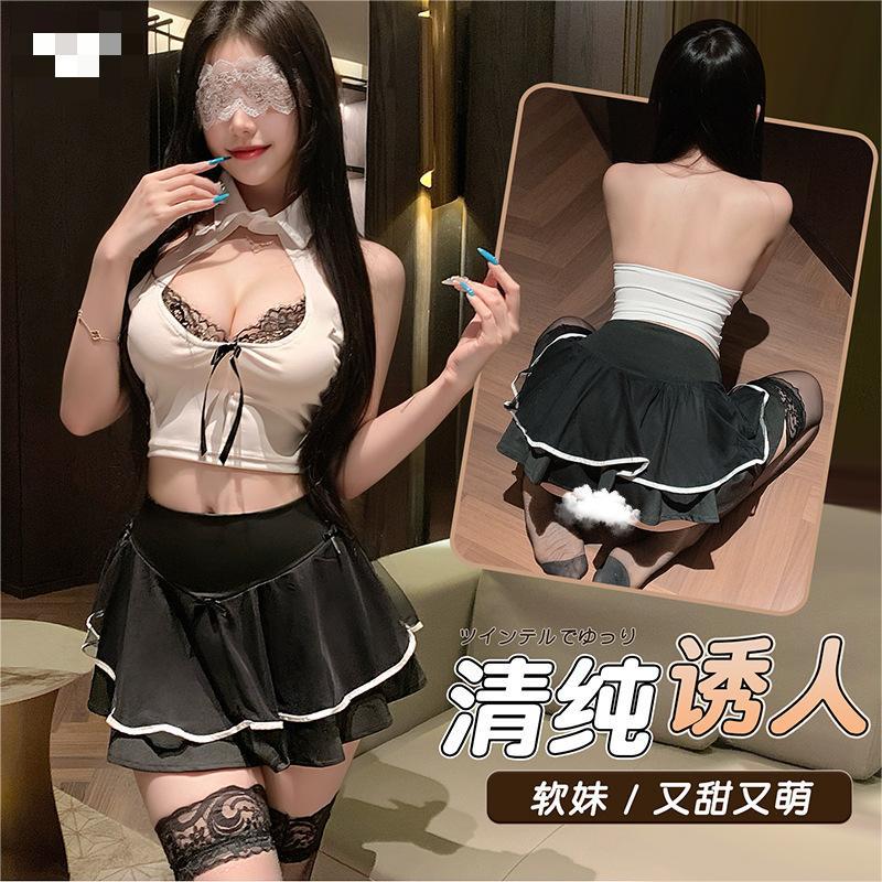 软妹丝绒拼蕾丝连体女仆短裙性感纯欲裸臀免脱诱惑情趣内衣5194