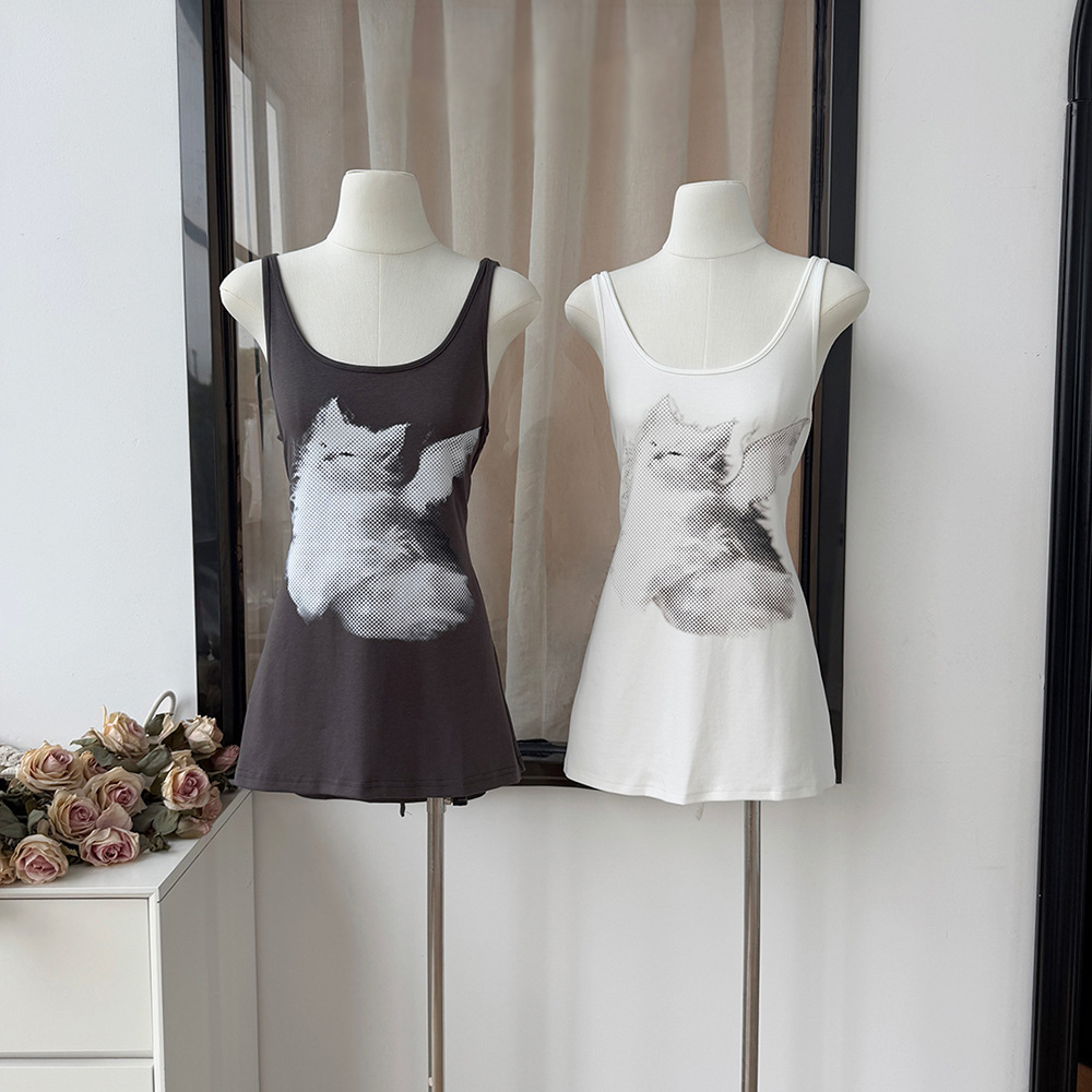 拉斐尔的猫 纯欲辣妹大领口绑带两穿吊带裙猫咪印花背心上衣夏季