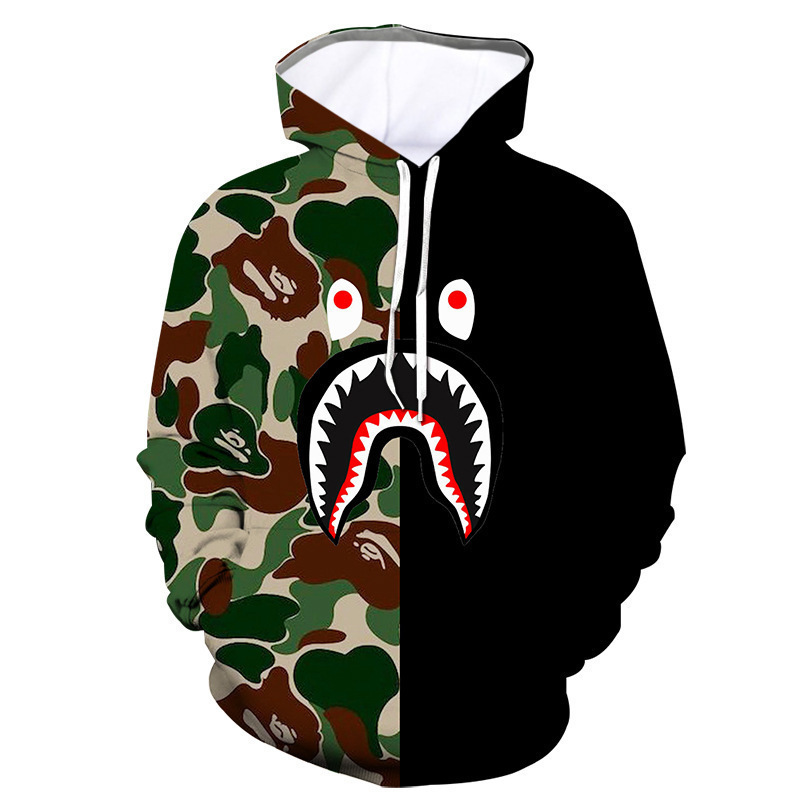 厂家跨境3D数码印花连帽衫休闲男装鲨鱼头连帽衫套头卫衣一件代发