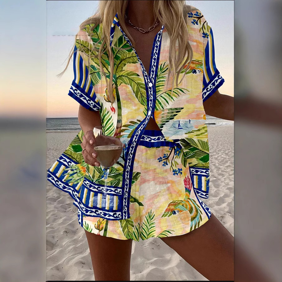 2025夏季旅游休闲度假沙滩短袖套装3D印花短袖翻领衬衣开衫女套装