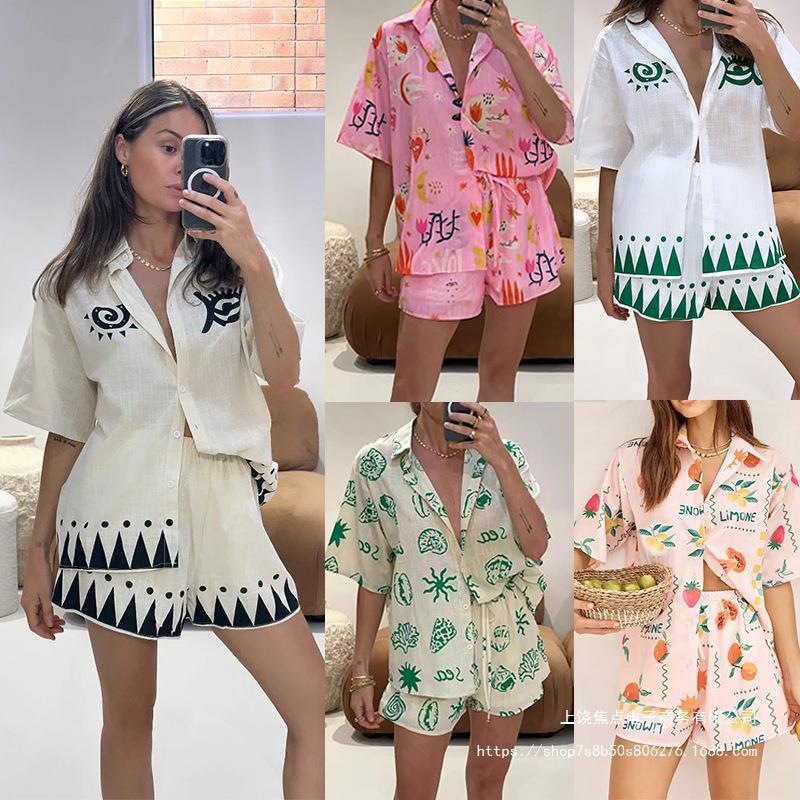 2024春夏亚马逊跨境女装3D印花抽绳宽松衬衫短裤通勤裤套装女欧美