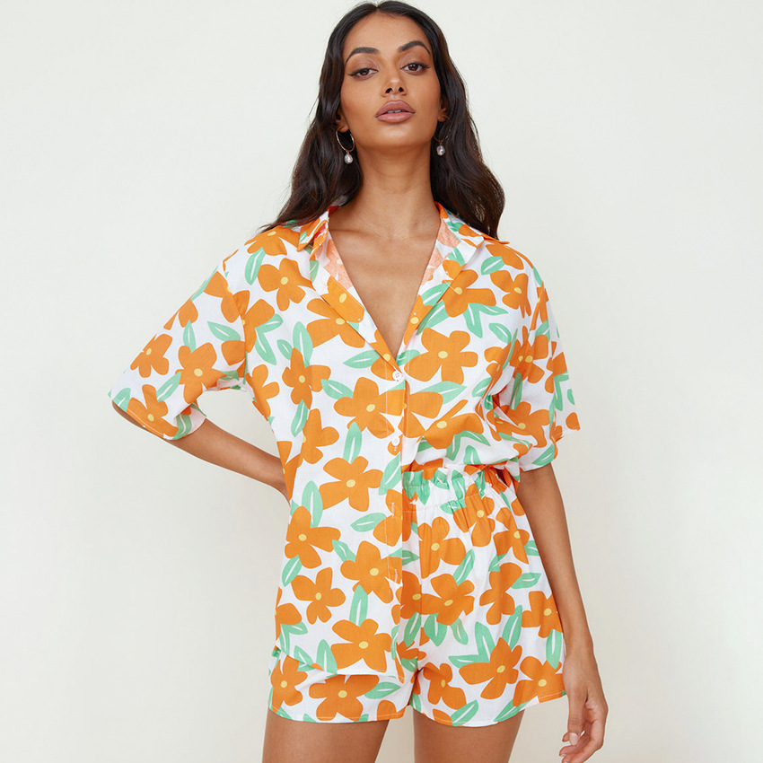 欧美夏季新款女装时尚印花休闲度假风开衫短裤套装POD一件定 制