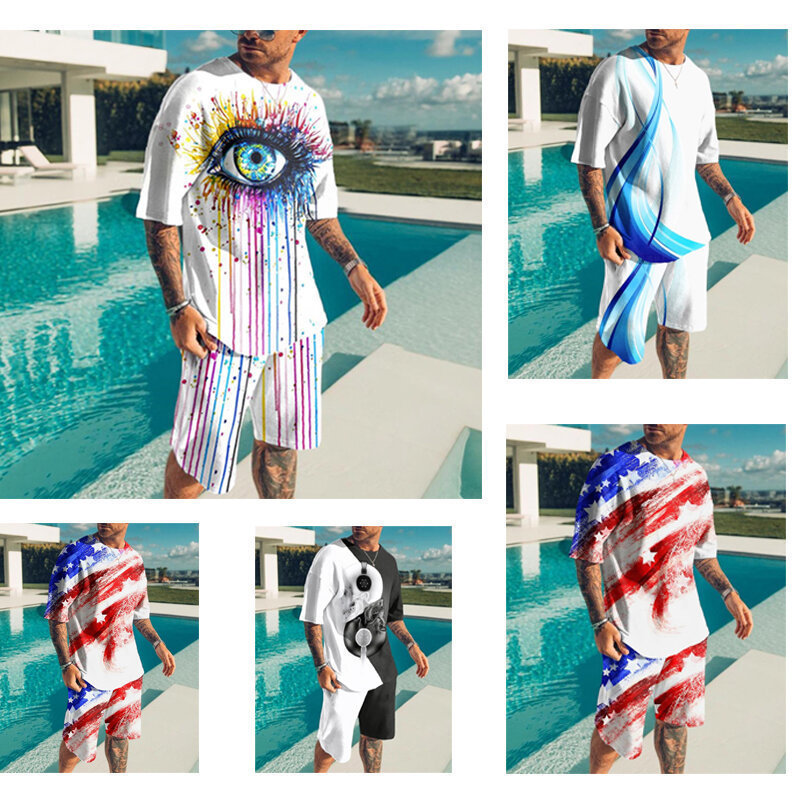 2022欧美夏季男士潮流休闲沙滩风质感3D数码印花T恤短裤套装
