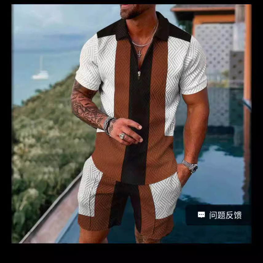 2023新款跨境欧美男装独立站货源休闲时尚POLO拉链翻领衫短袖套装
