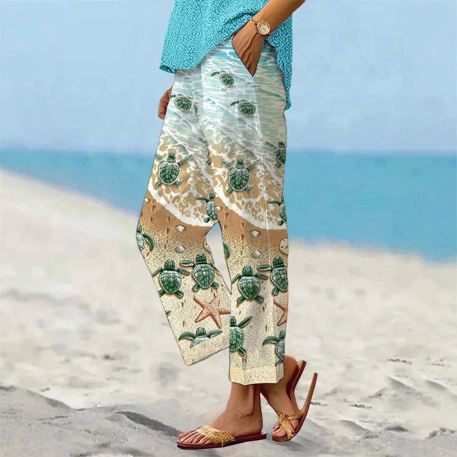 2024亚马逊欧美时尚休闲跨境沙滩海龟3D印花玲珑麻休闲裤POD定 制
