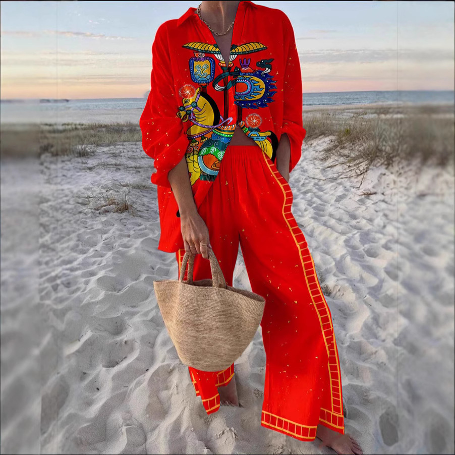 2025春秋款3D数码印花女士长袖衬衫时尚个性潮牌鲜艳色彩休闲套装