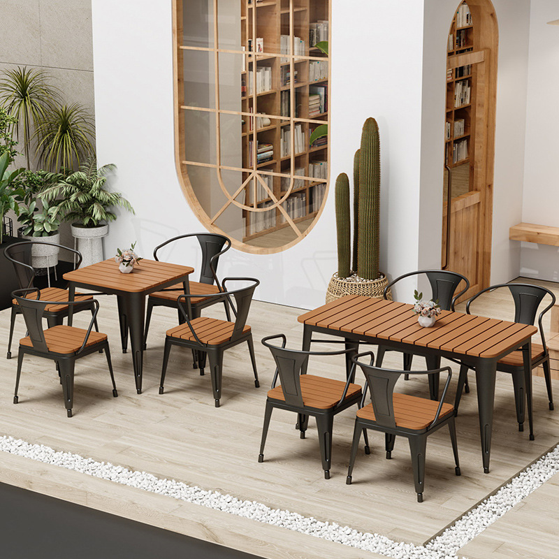 餐厅铁艺实木餐桌椅餐饮快餐小吃店商用饭店长方形烧烤桌子纯实木
