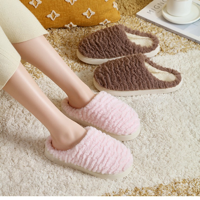 冬季波浪纹毛绒棉拖鞋情侣款加绒保暖居家鞋软萌多色厚底防滑拖鞋
