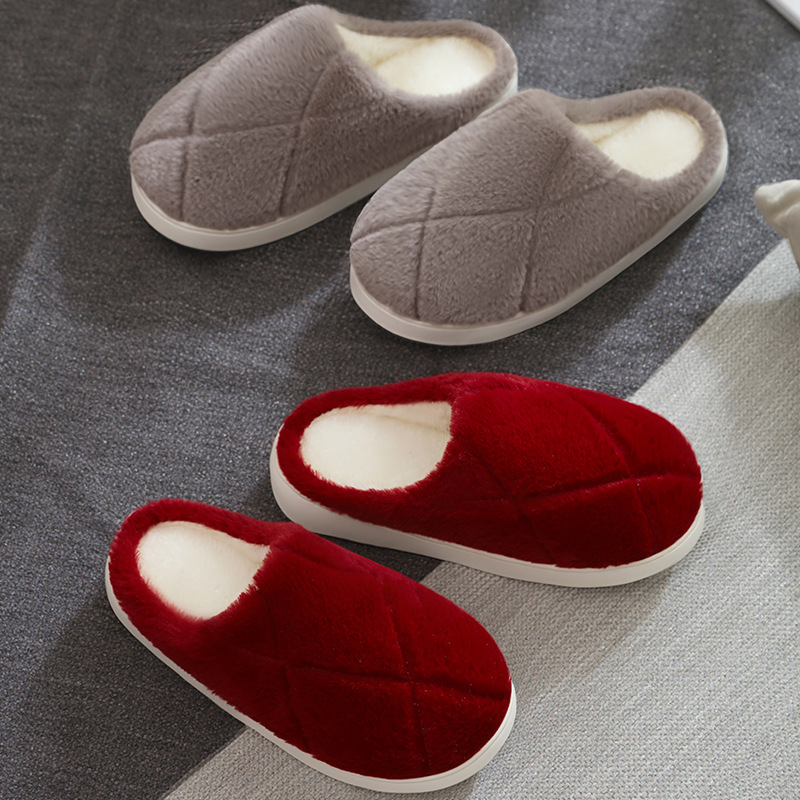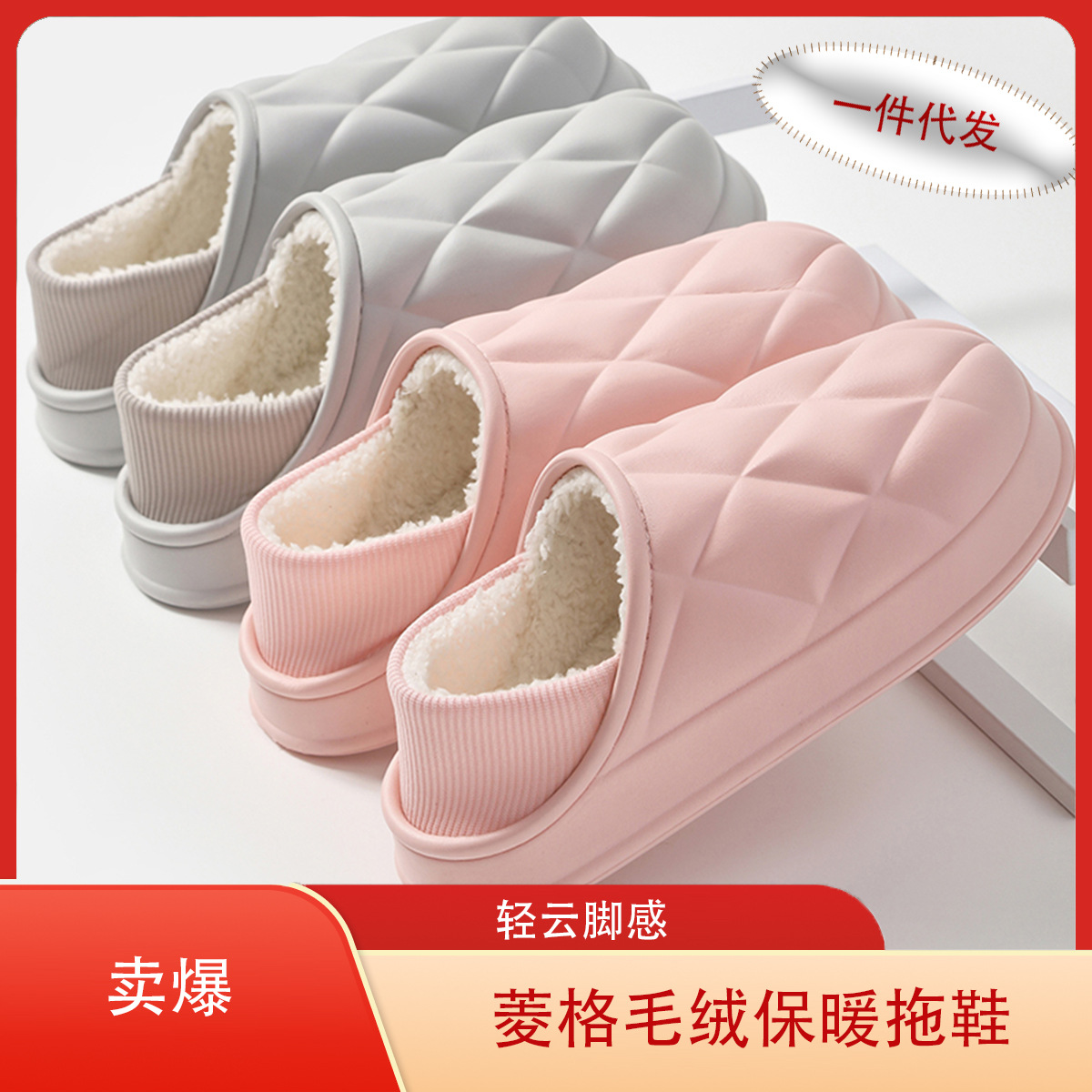冬季加绒棉拖鞋女男菱格纹防水耐磨踩屎感软底保暖居家外穿适配