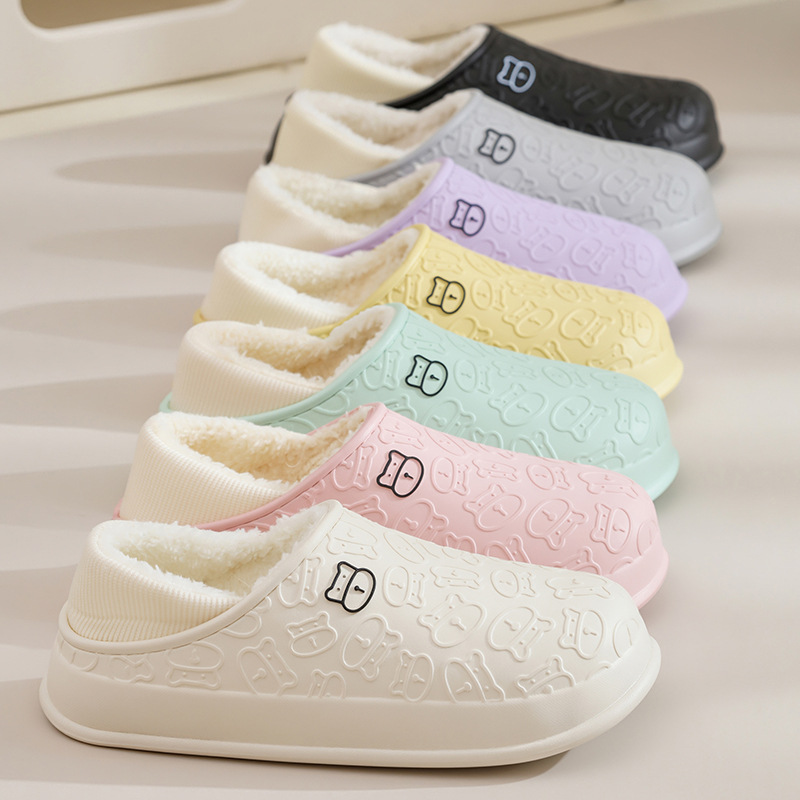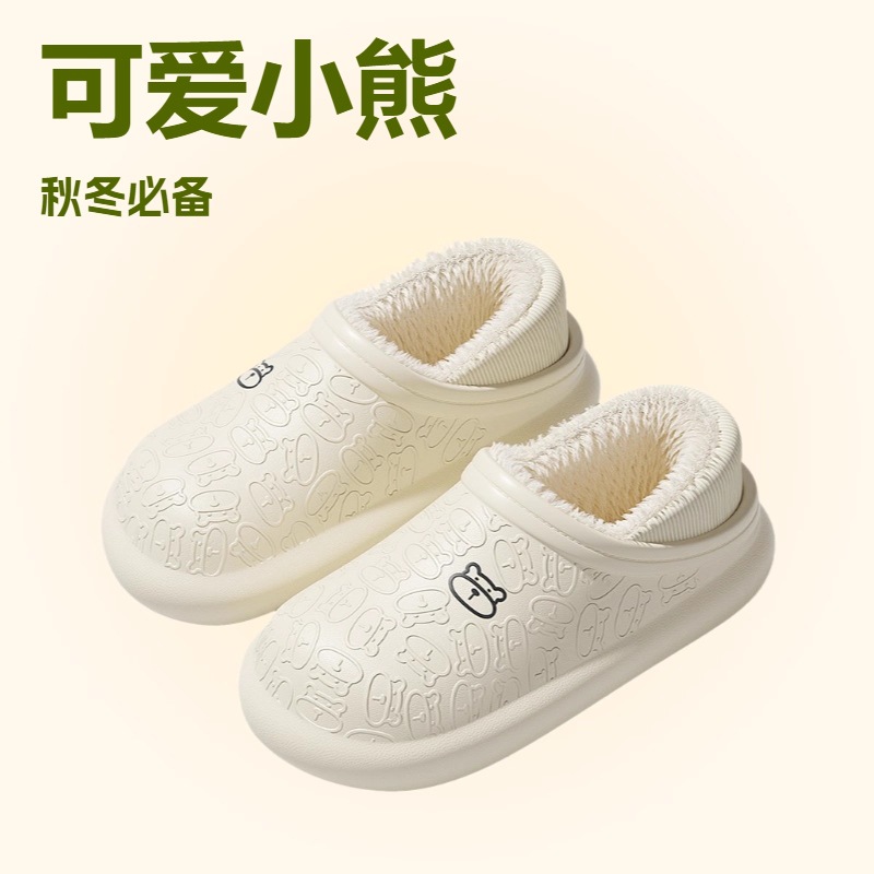 冬季卡通熊压纹防水棉拖鞋情侣款加绒保暖居家鞋厚底防滑外穿包头