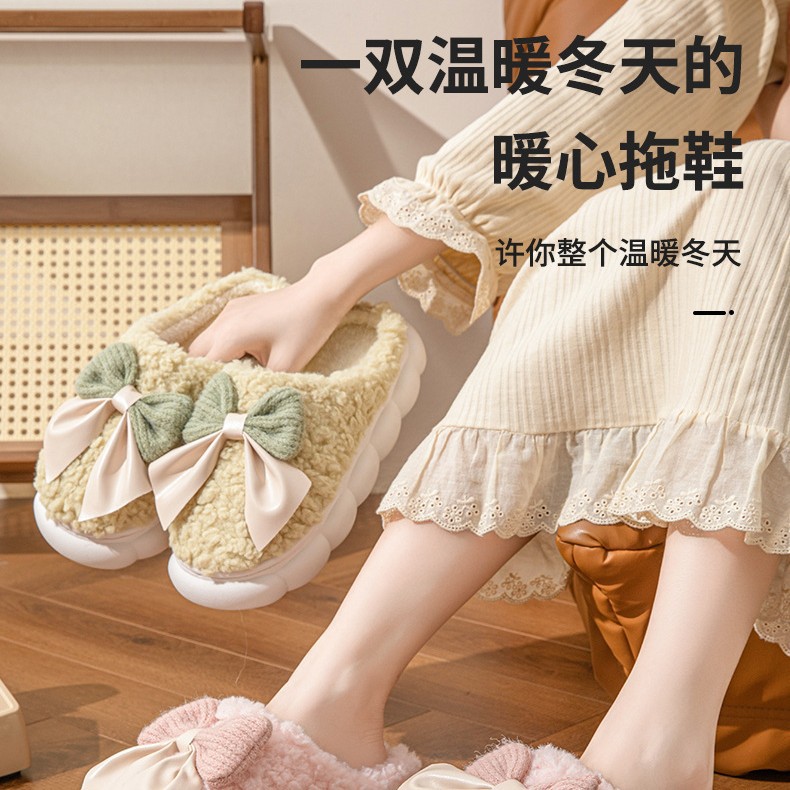 冬季蝴蝶结羊羔毛棉拖鞋少女款软萌加绒保暖鞋厚底防滑居家棉拖鞋