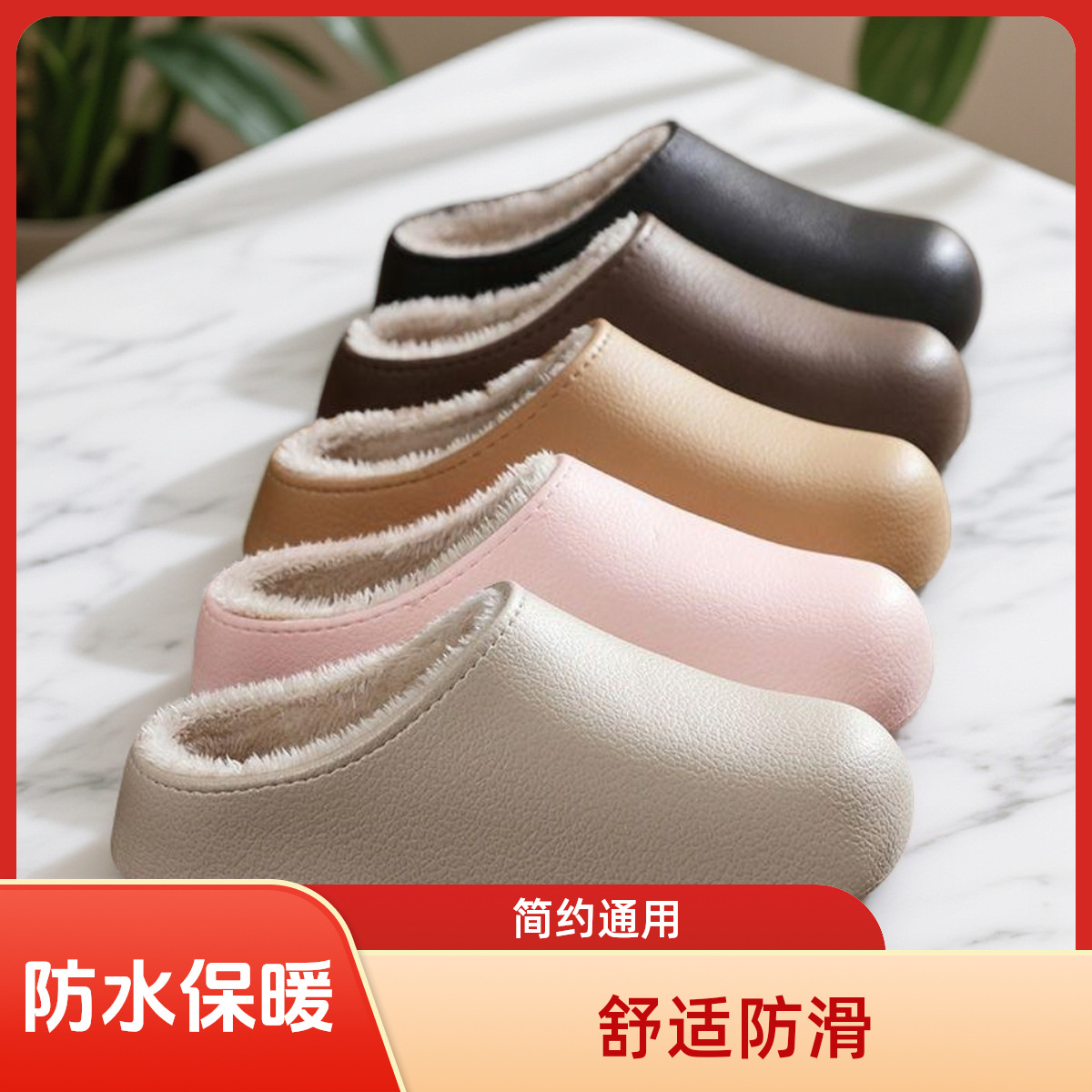 冬季防水皮面棉拖鞋情侣款加绒保暖居家鞋男女室内外防滑舒适棉拖