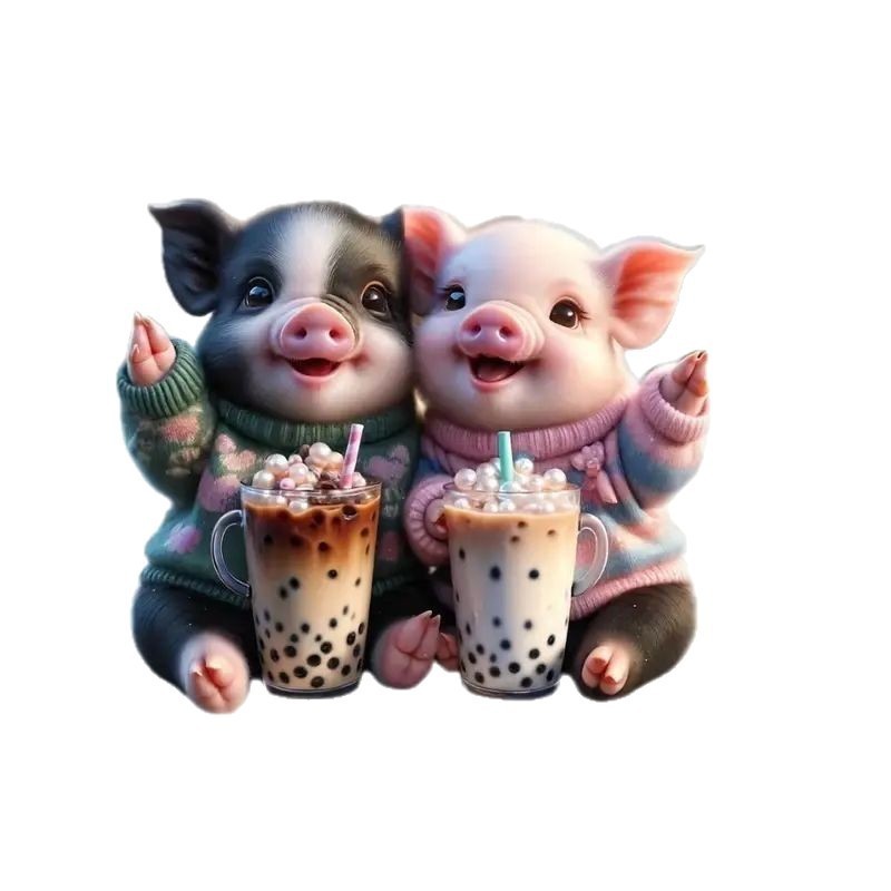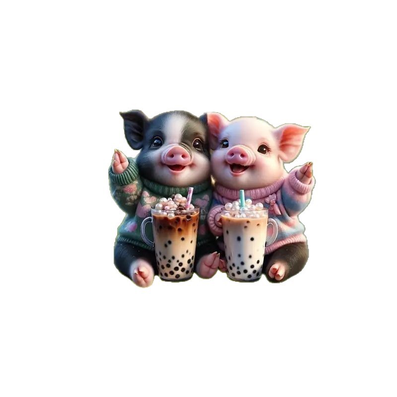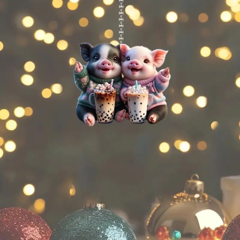 跨境新款亚克力平面向喝奶茶的两只小猪汽车挂件小猪汽车摆件
