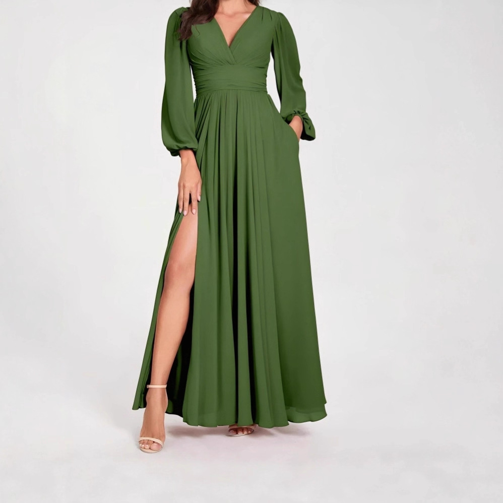 2025秋冬欧美跨境新款纯色v领开叉长袖褶皱优雅女装长款连衣裙