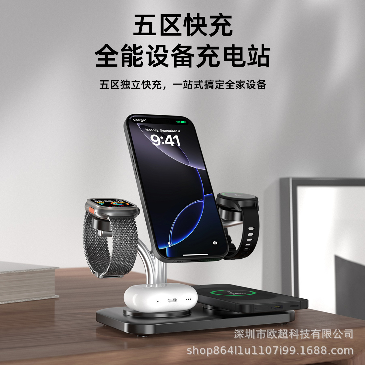 新款五合一磁吸无线充电器适用于iphone多功能手机手表充支架闪充