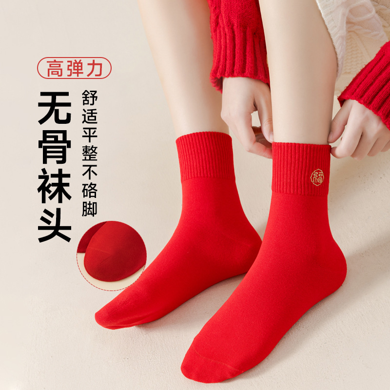 2026马年本命年红袜子男士金边刺绣纯棉中筒袜秋冬结婚发财鸿运袜