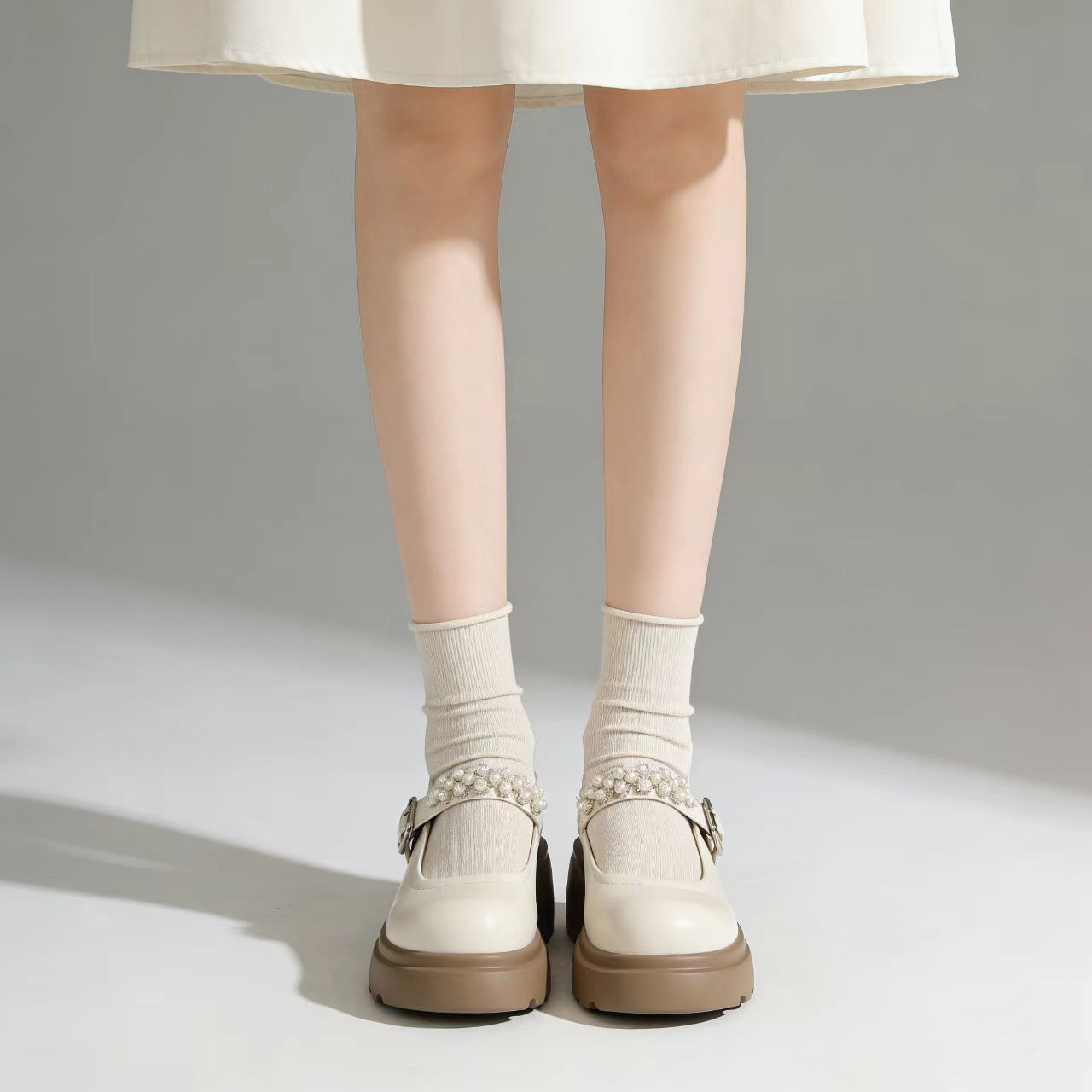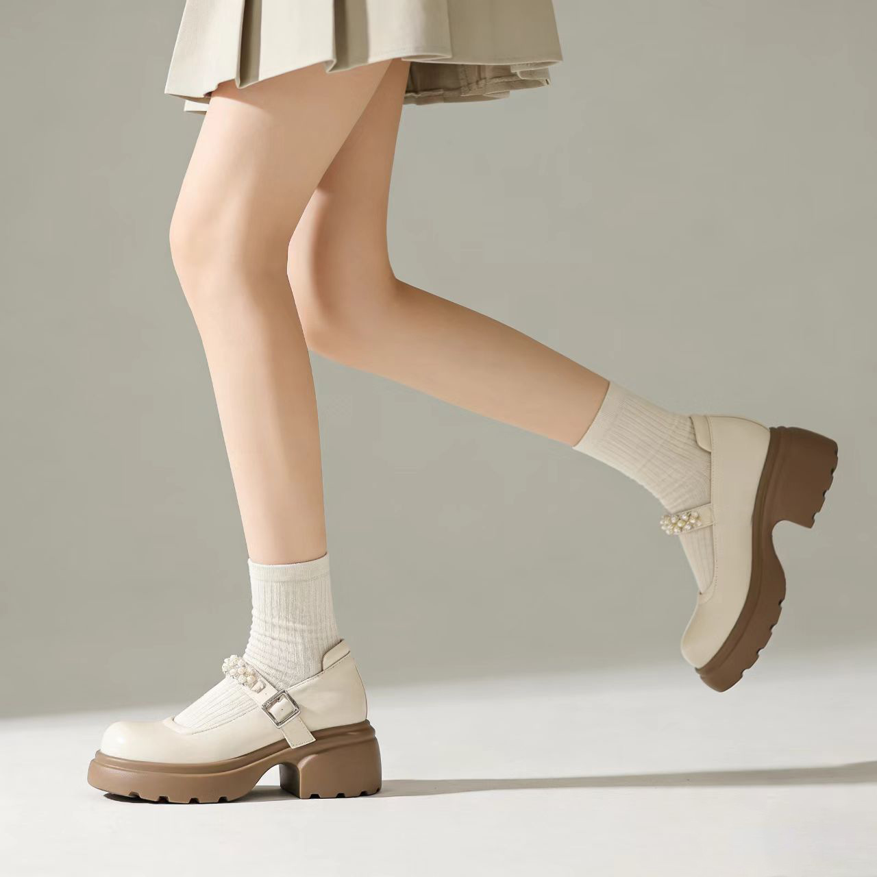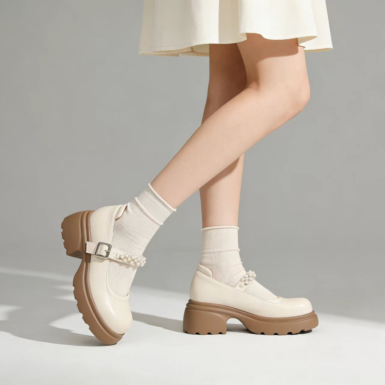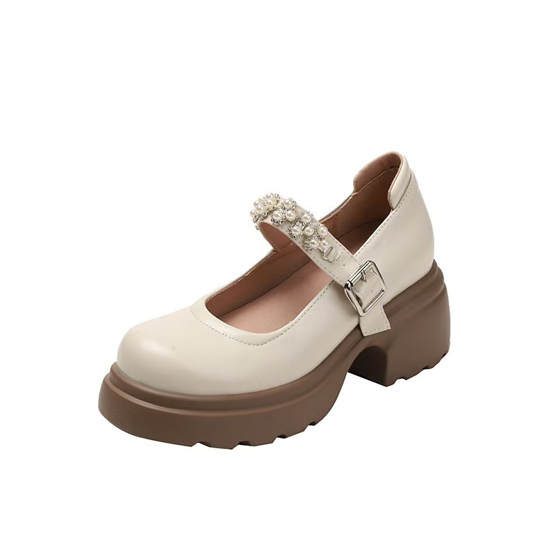 千履汇 舒适柔软仙女风小皮鞋珍珠装饰一字带厚底内增高玛丽珍鞋