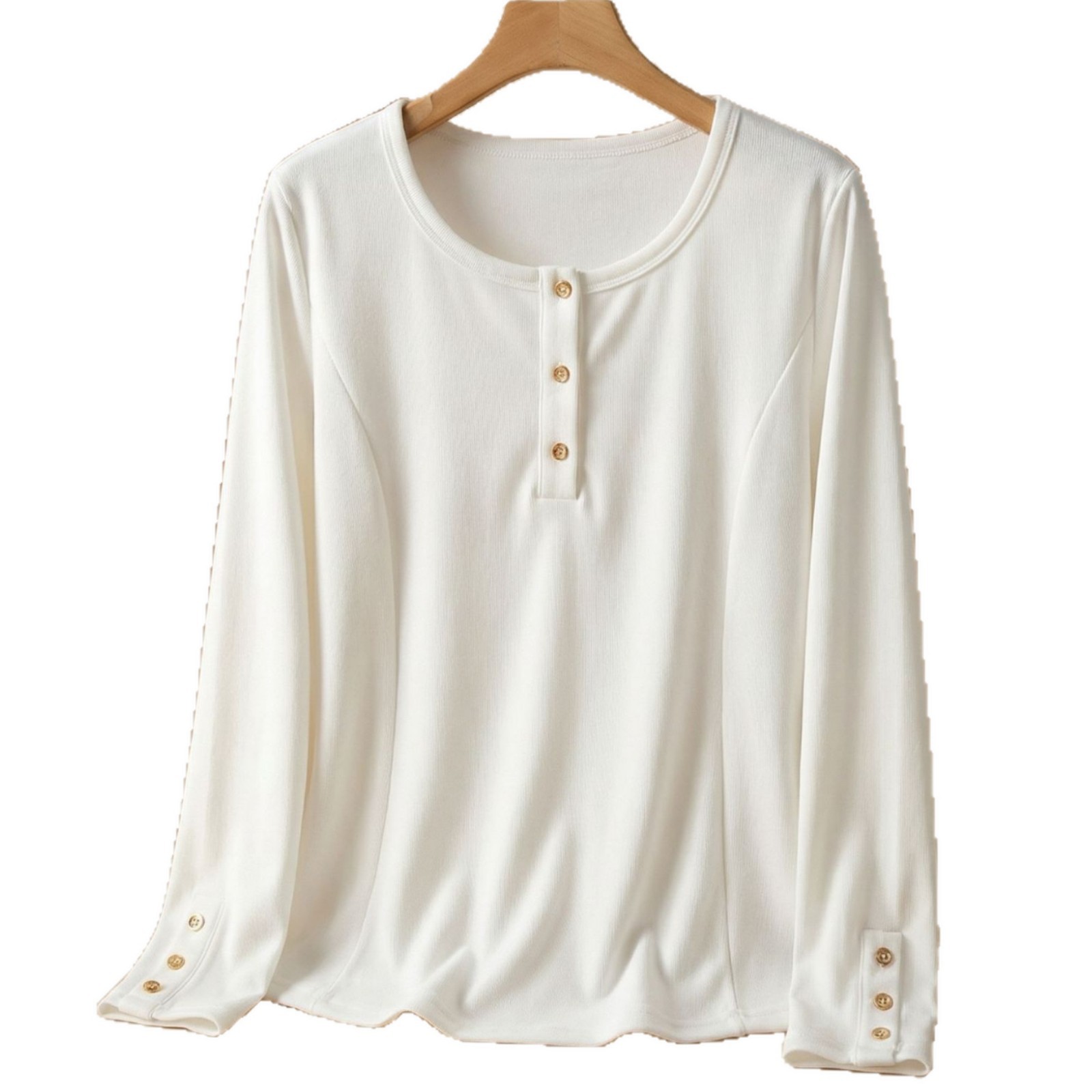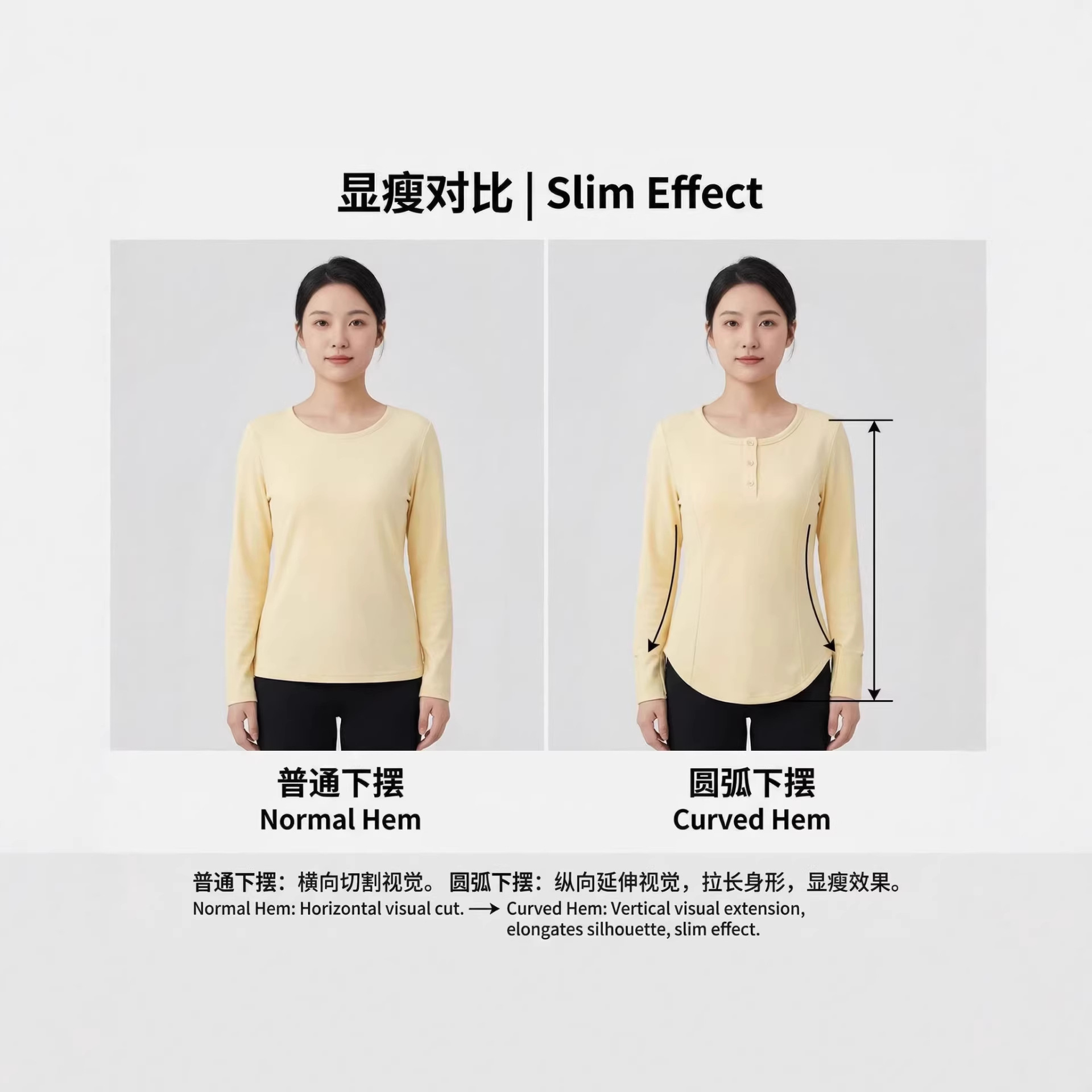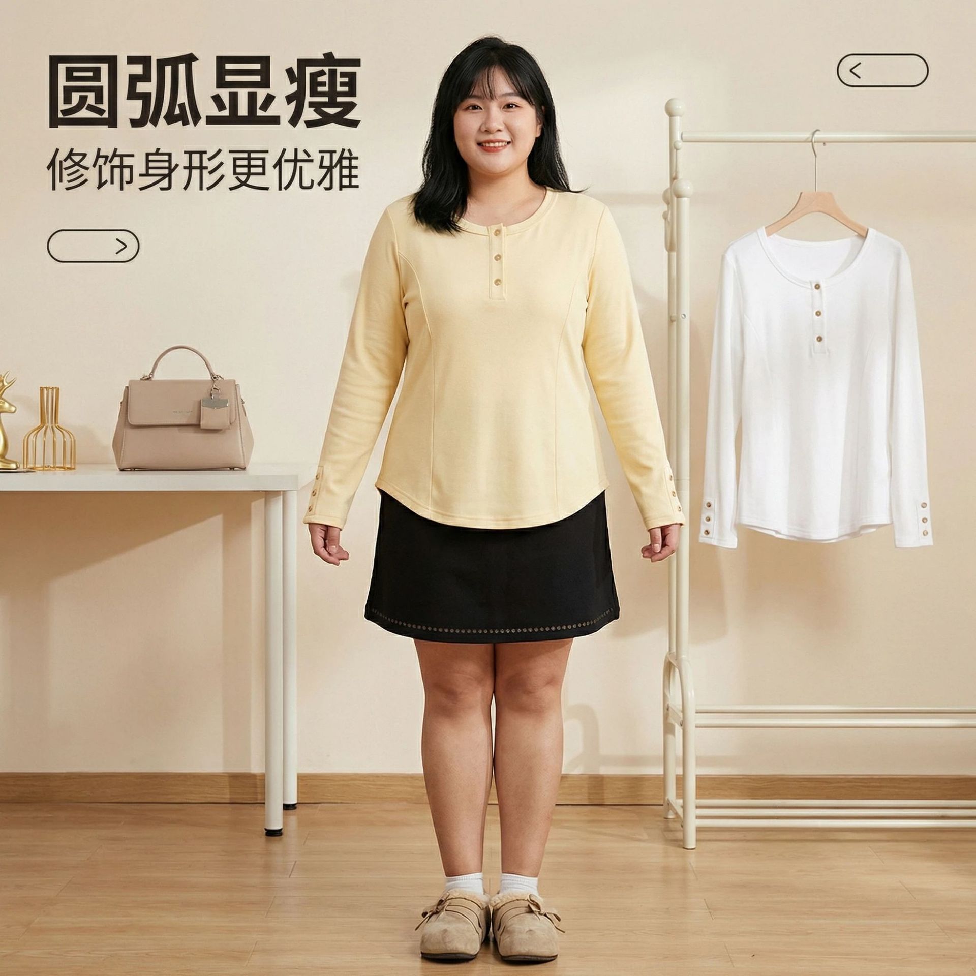 2026春季新款 大码女装日韩休闲 长袖德绒纯色圆弧型下摆 设计t恤
