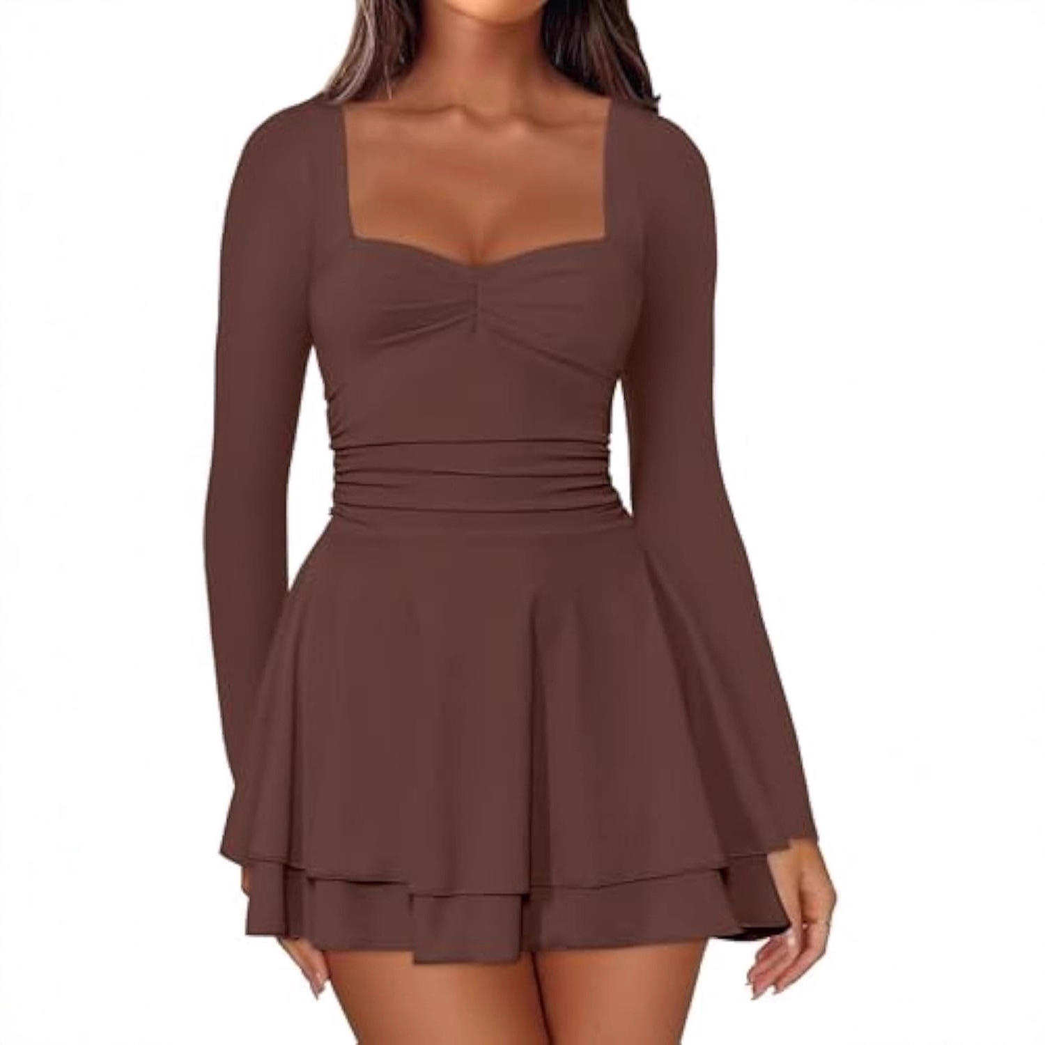 欧美跨境亚马逊爆款方领长袖抽褶裙 双层大摆通勤派对连衣裙