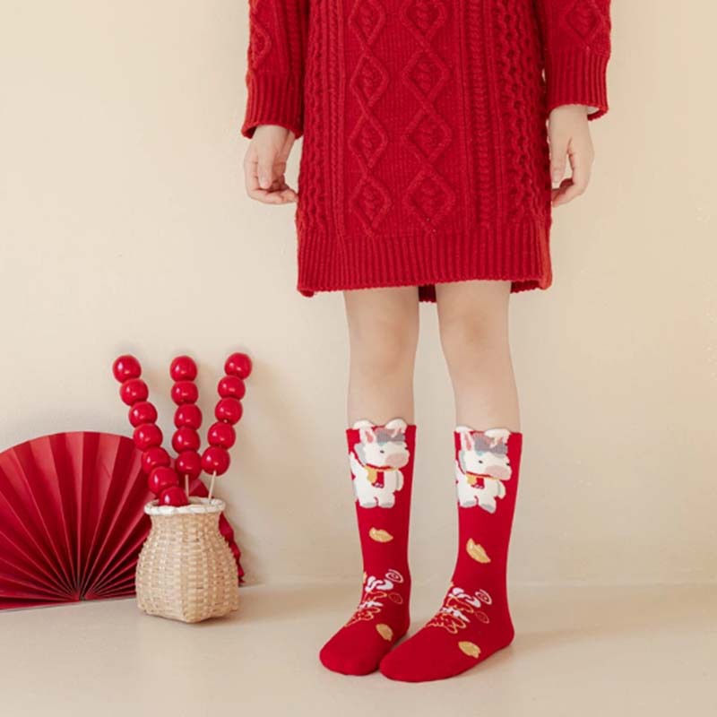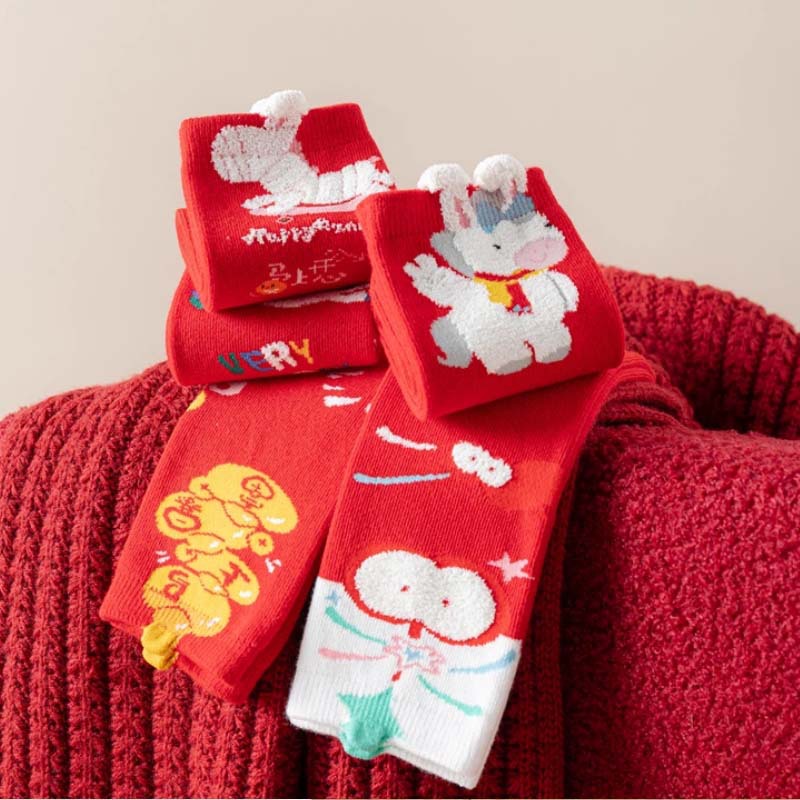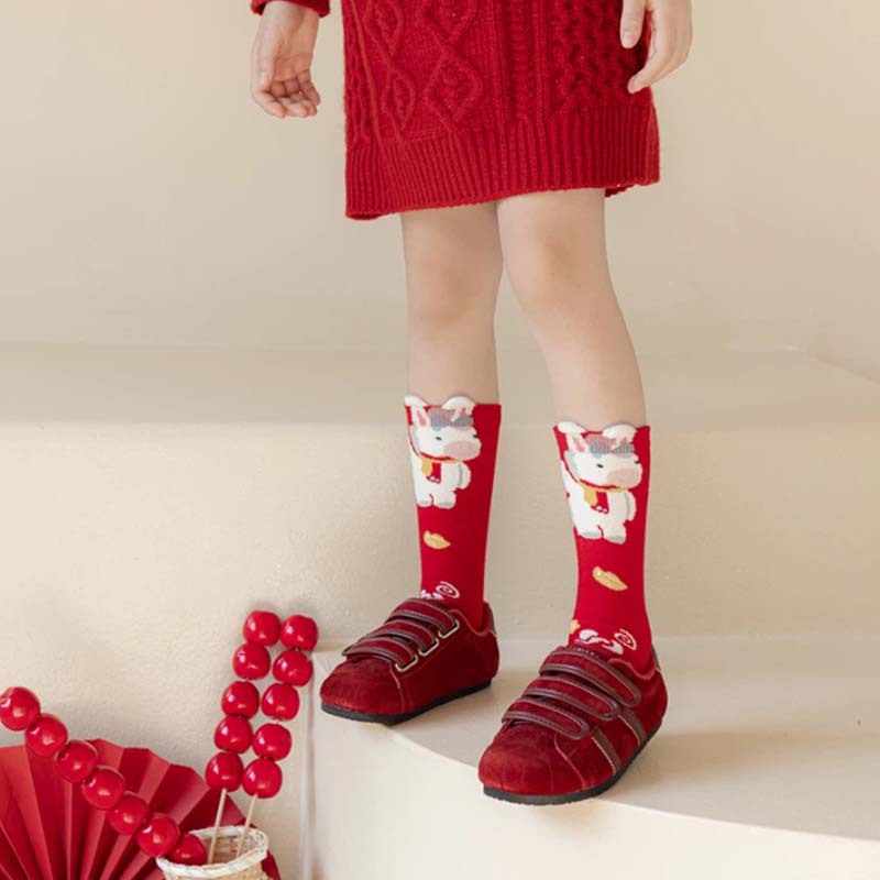 马年本命年红袜子秋冬款舒适儿童新年红色过年卡通中筒袜运动袜