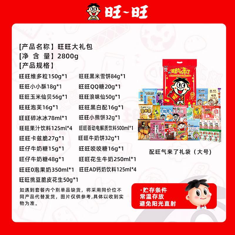 包装规格 | 【2.8kg旺旺大礼包(旺气来了巨型零食包大号)】 | | 包装规格 | 【3.38kg旺旺大礼包(旺气来了巨型零食包大号)】 |