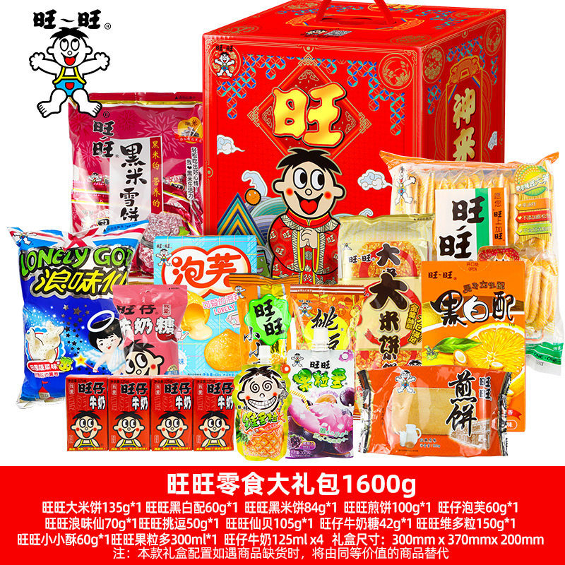 | 包装规格 | 【好运常来】旺旺大礼包1708g | 包装规格 | 【神来气旺】旺旺大礼包1600g |