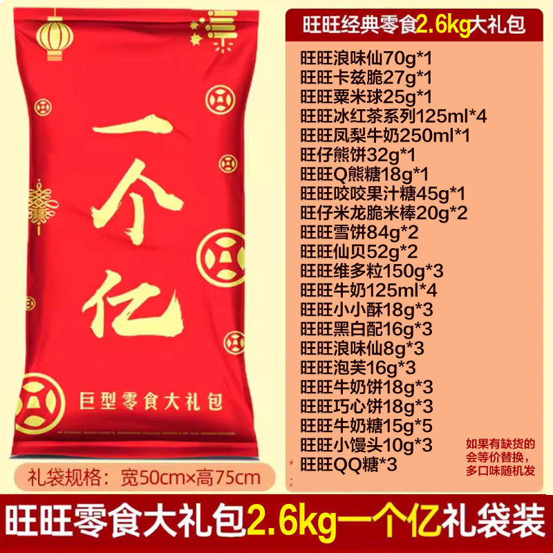| 包装规格 | 旺旺礼盒幸运款--招财进旺礼盒 | 包装规格 | 超大一个亿1068g大礼包组合 |