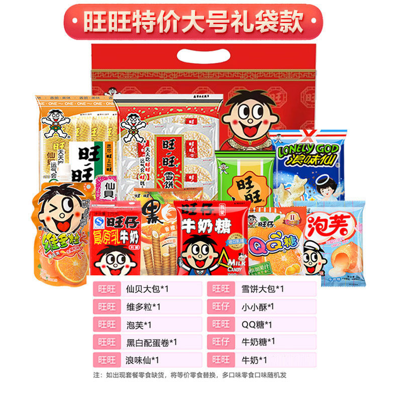 | 包装规格 | 旺旺品尝包好运锦鲤 | 包装规格 | 旺旺小吃礼袋(适合做小礼品) |