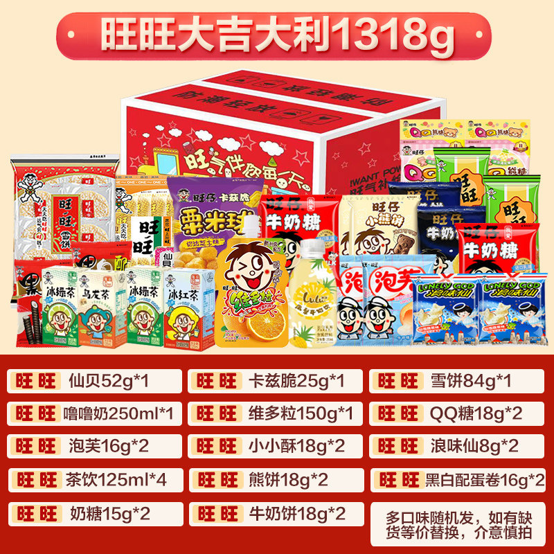 | 包装规格 | 旺大吉大利1318g-开箱旺旺礼盒 | 包装规格 | 旺大团圆1818g-开箱旺旺礼盒 |