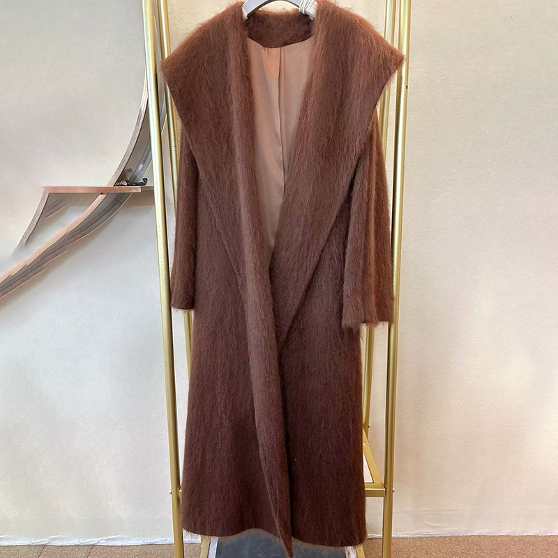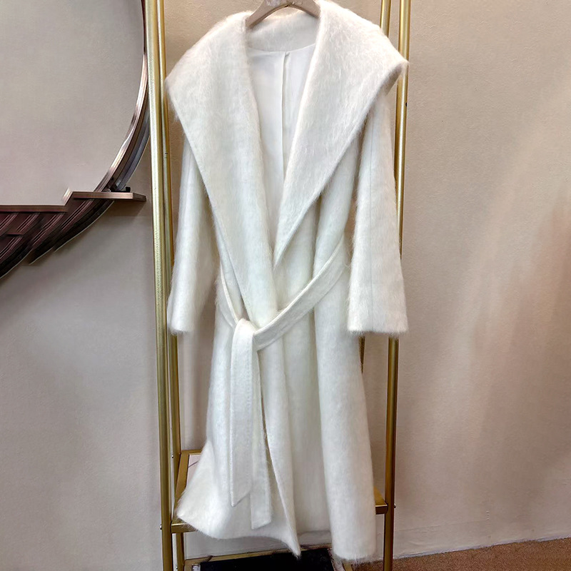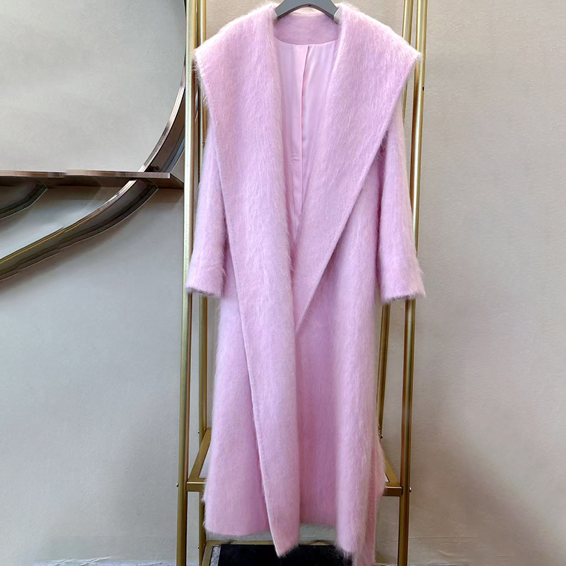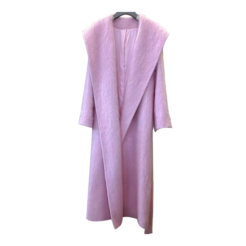 拉绒大衣女秋冬款气质大翻领时尚休闲绑带羊绒加长款外套羊绒混纺