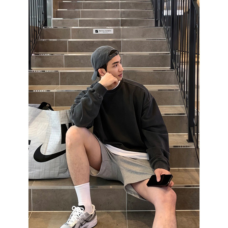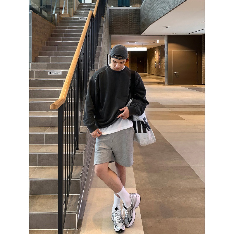 复古做旧圆领卫衣男春秋款水洗重工拼接设计套头外套阔版运动上衣