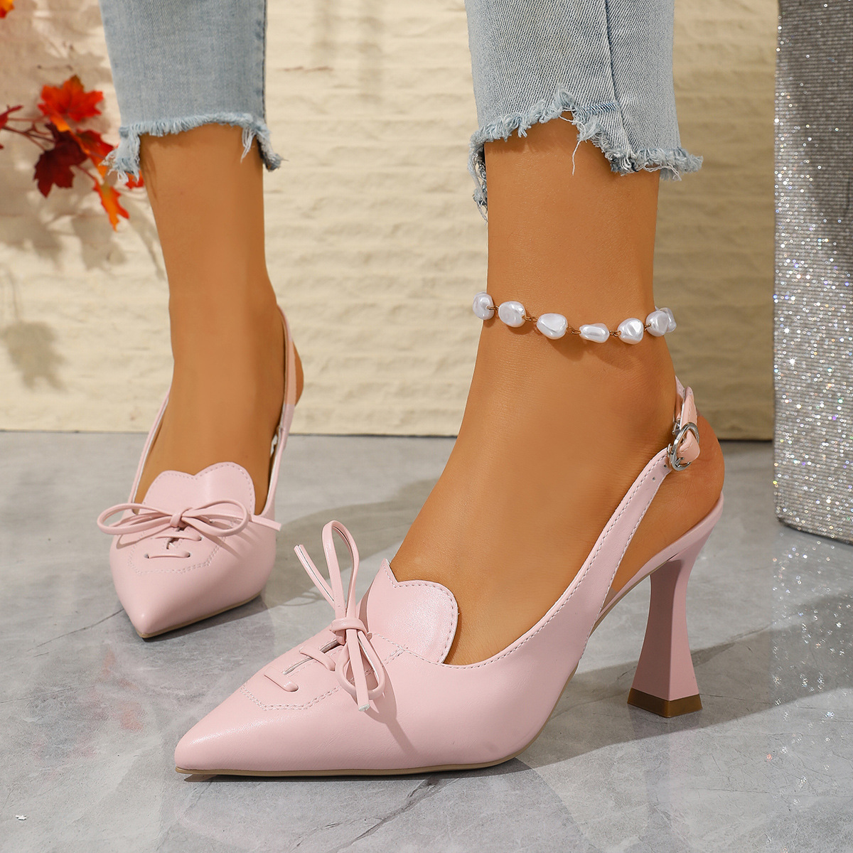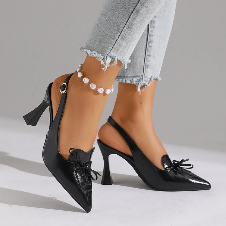 mi家尖头细跟绑带蝴蝶结凉鞋2026新款漆皮高跟鞋后绊包头后空女鞋