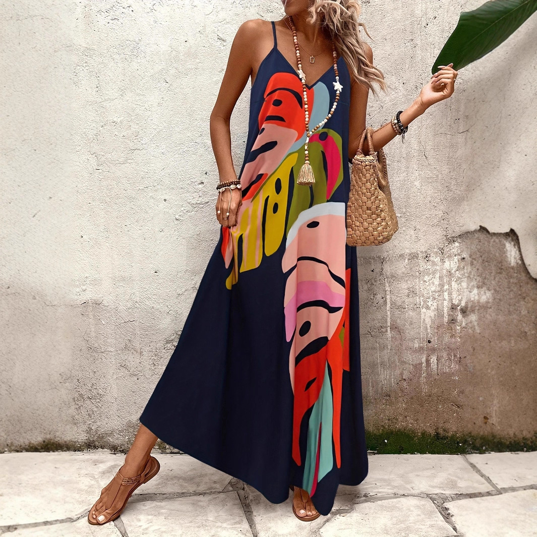 2025跨境欧美沙滩罩衫宽松长袍度假外搭比基尼防晒印花吊带连衣裙