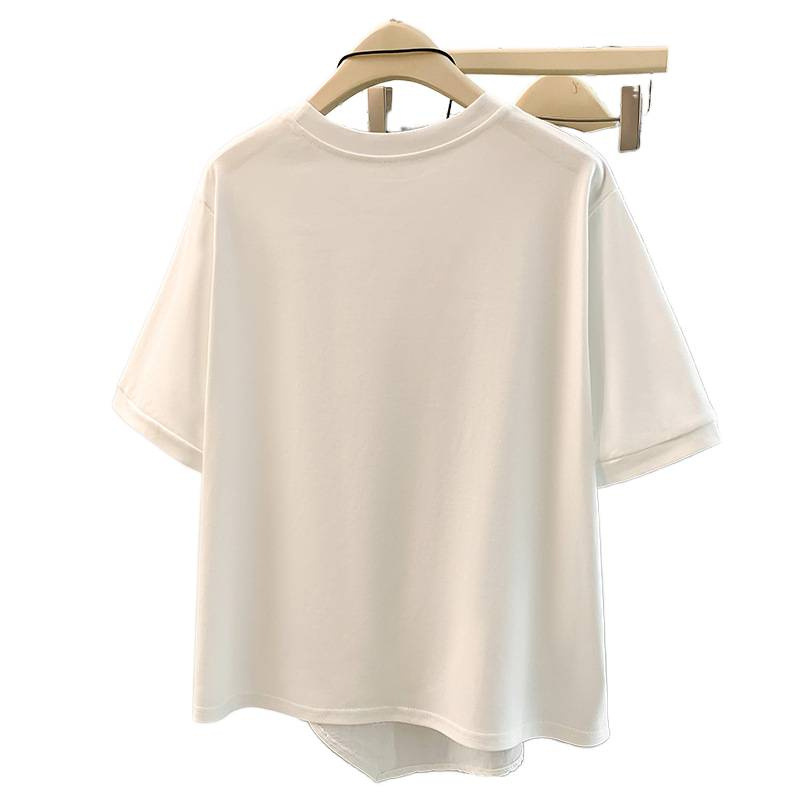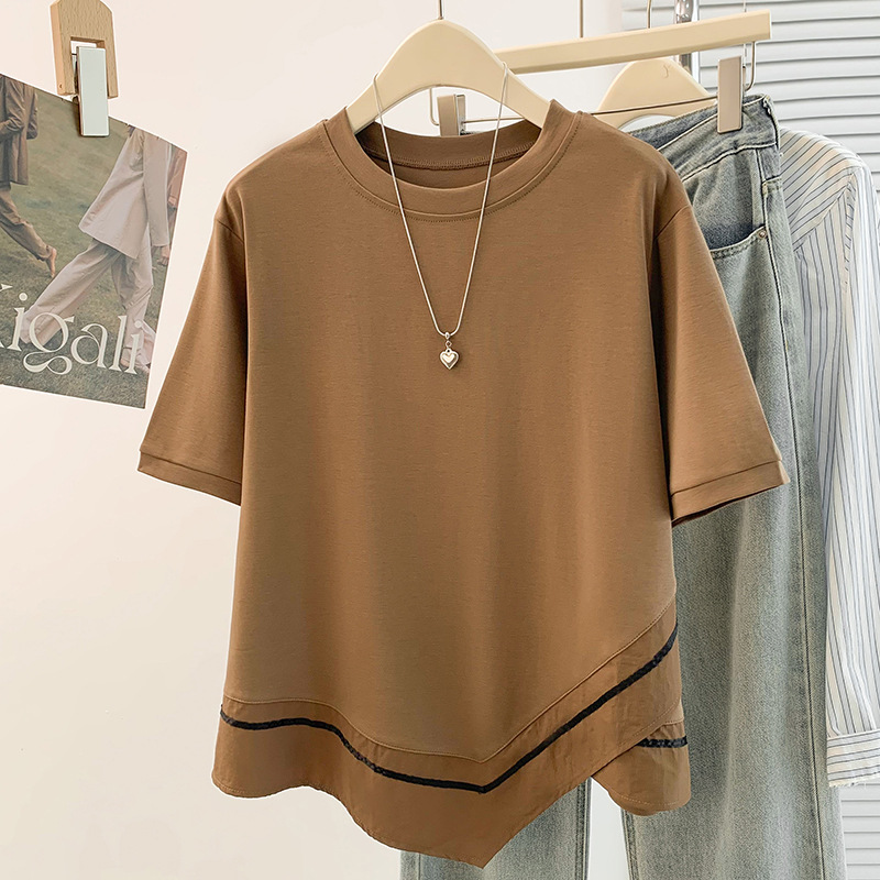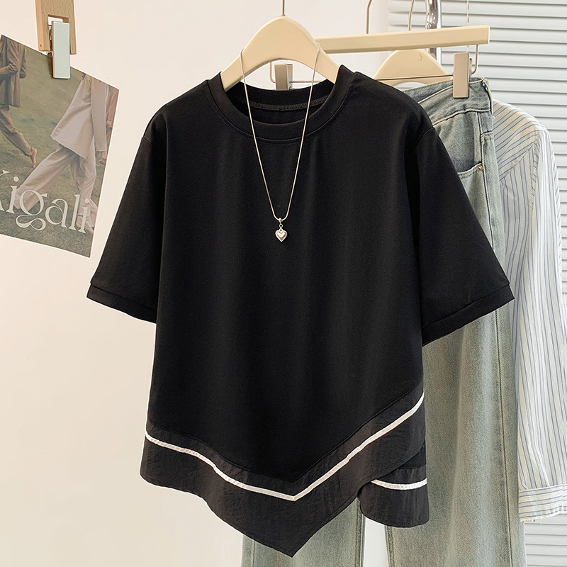 2026春季新款大码设计感不规则休闲遮肚子显瘦撞色拼接短袖T恤