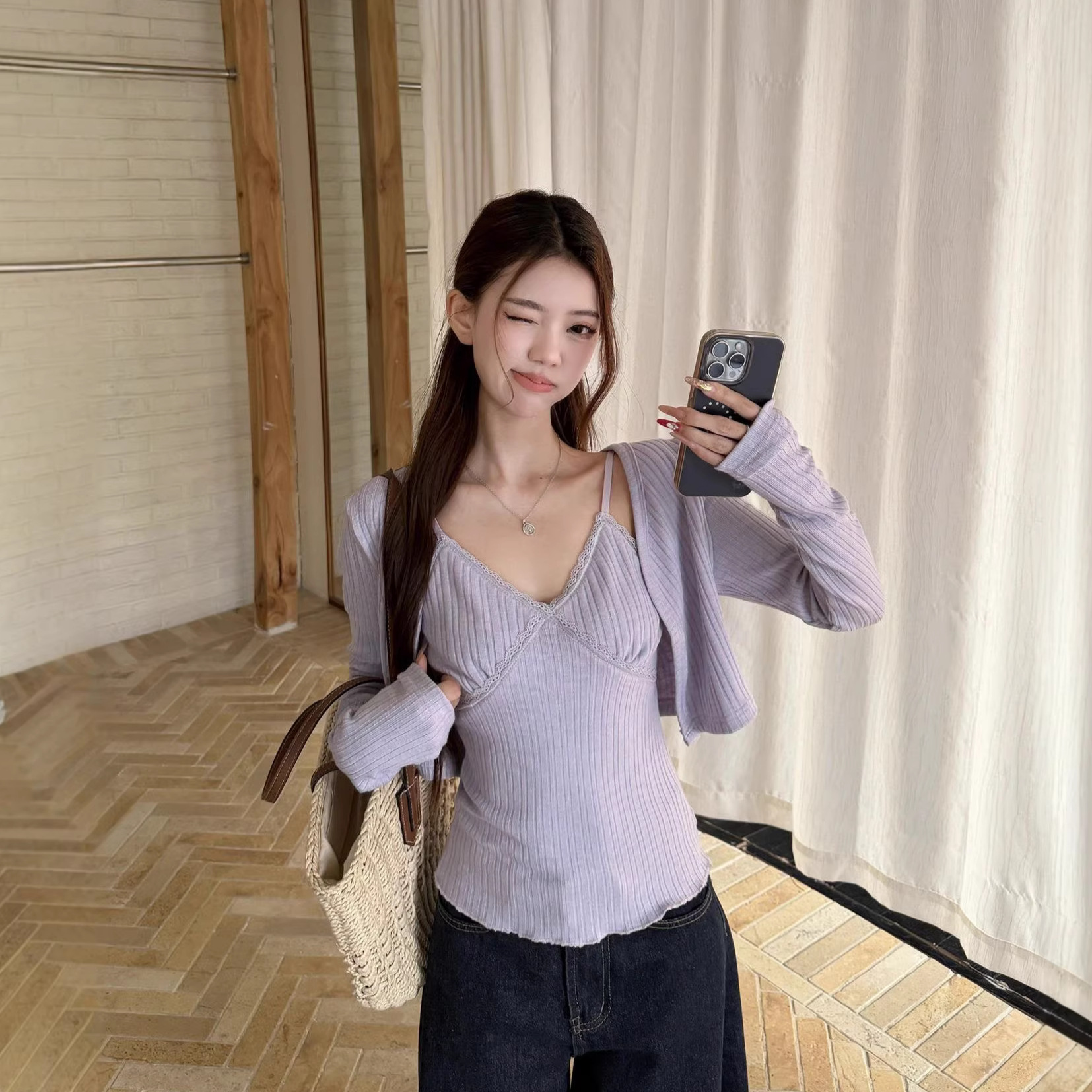 温柔减龄紫色套装女春秋2026新款长袖针织开衫内搭V领吊带两件套