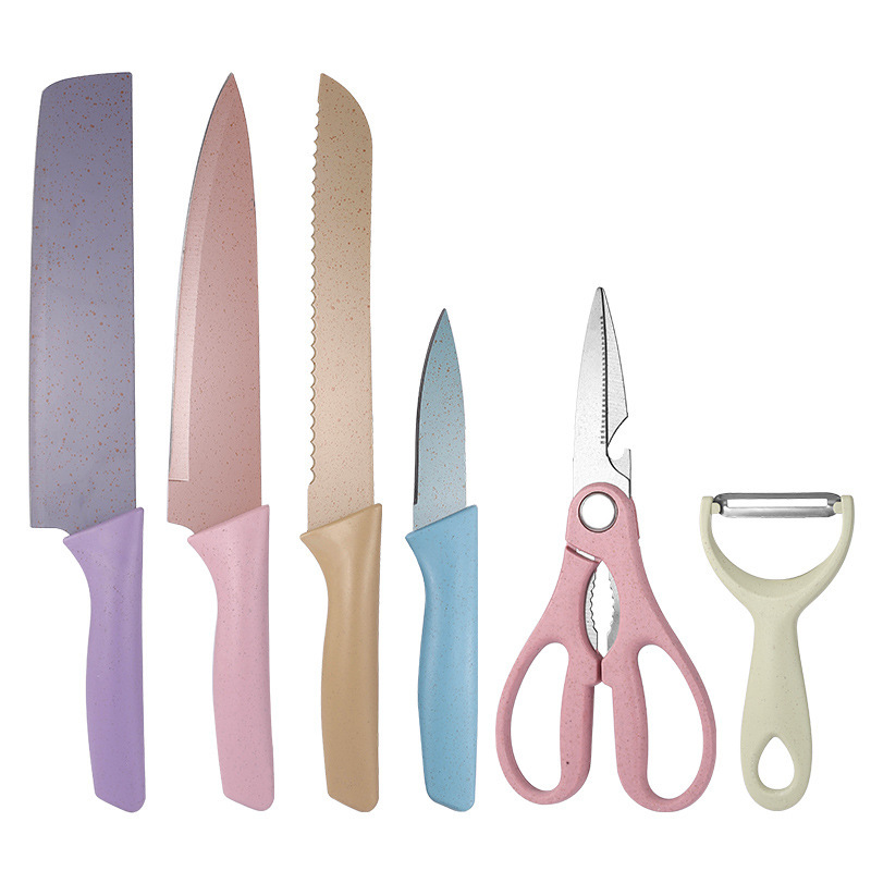 现货马卡龙刀具套装彩色麦杆刀具6件套 不锈钢刀剪组合礼品套装