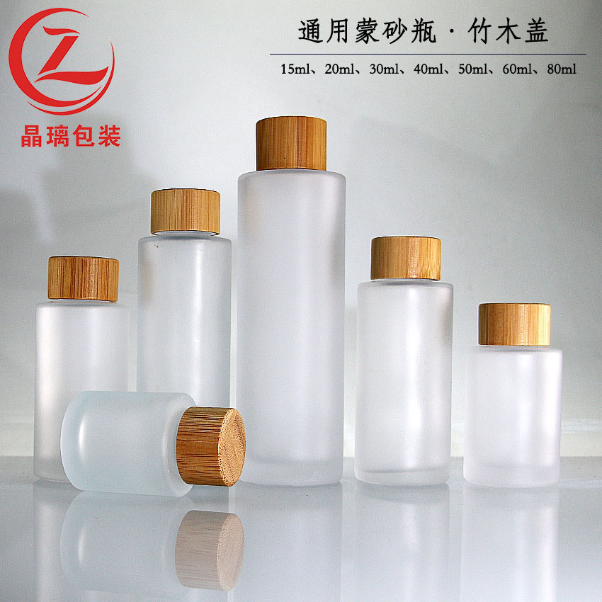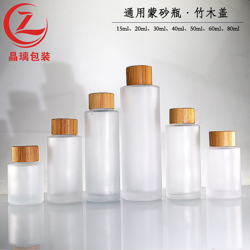 现货直圆磨砂竹木盖瓶20ml-80ml平肩精油瓶 通款亚克力套装玻璃瓶