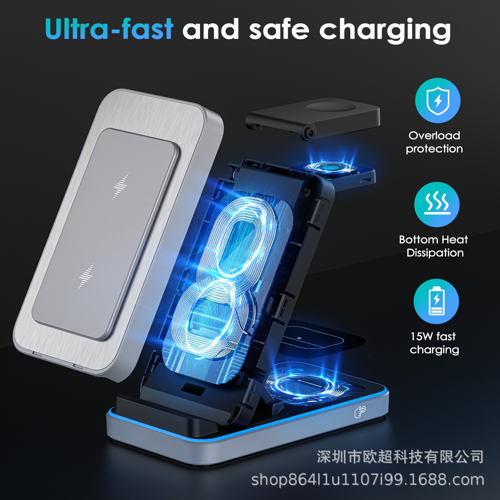 无线充电器三合一折叠支架立式适用苹果手机手表耳机快充多国认证