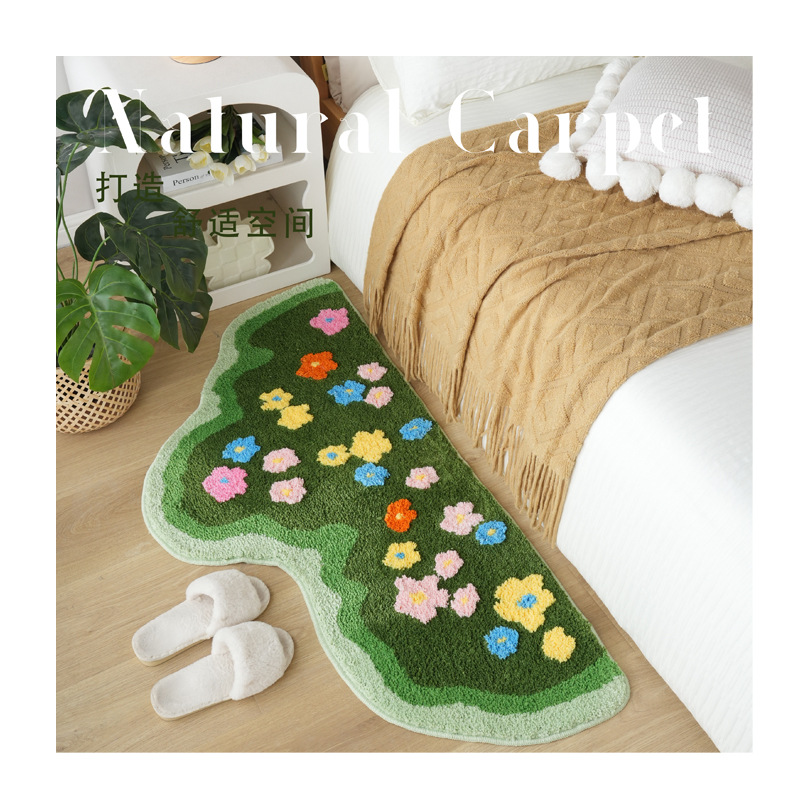 ins不规则机洗床边毯小清新苔藓凹凸提花加密地毯可折叠植绒地垫