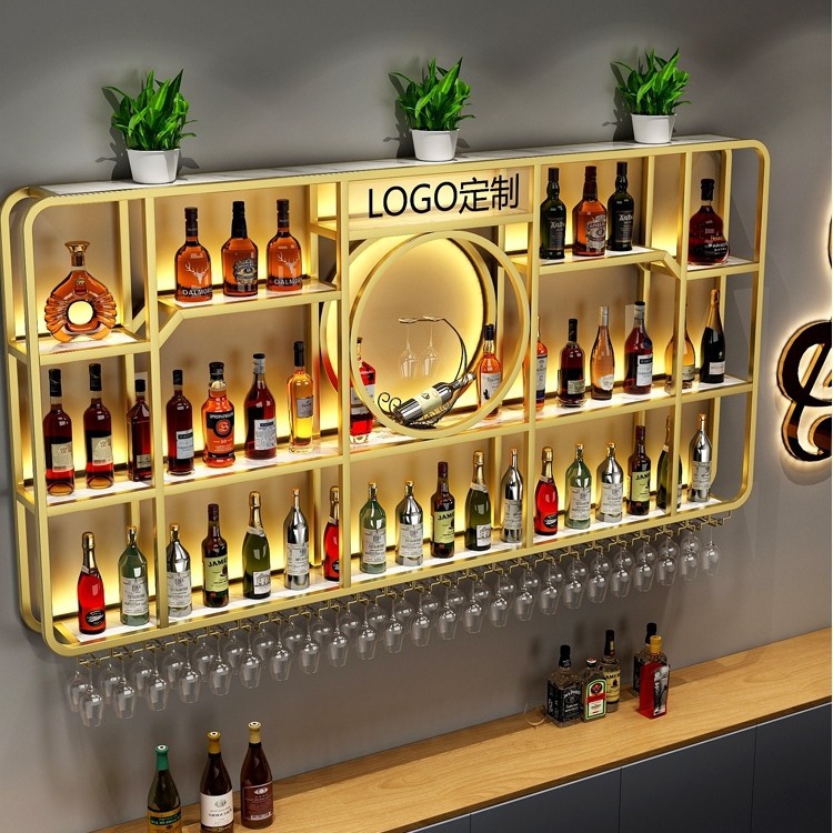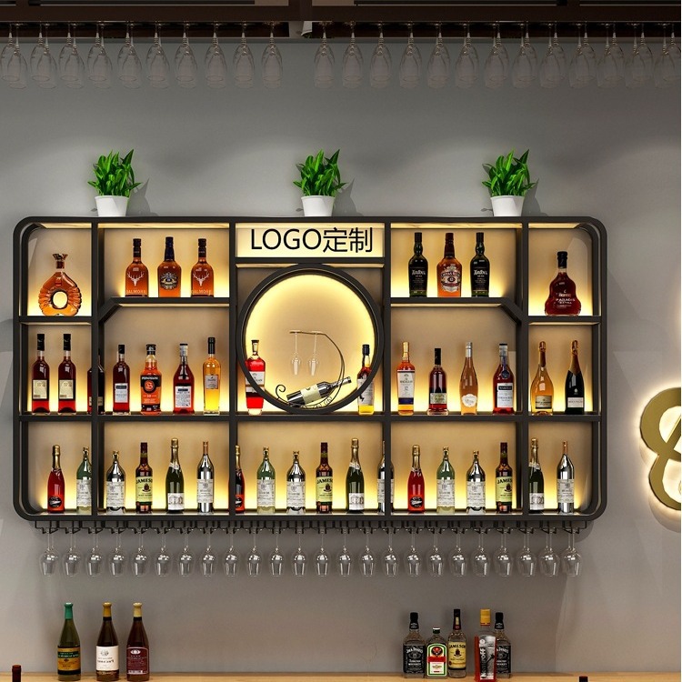 酒吧吧台酒柜壁挂餐厅墙上铁艺带灯展示架工业风酒架置物架轻奢风