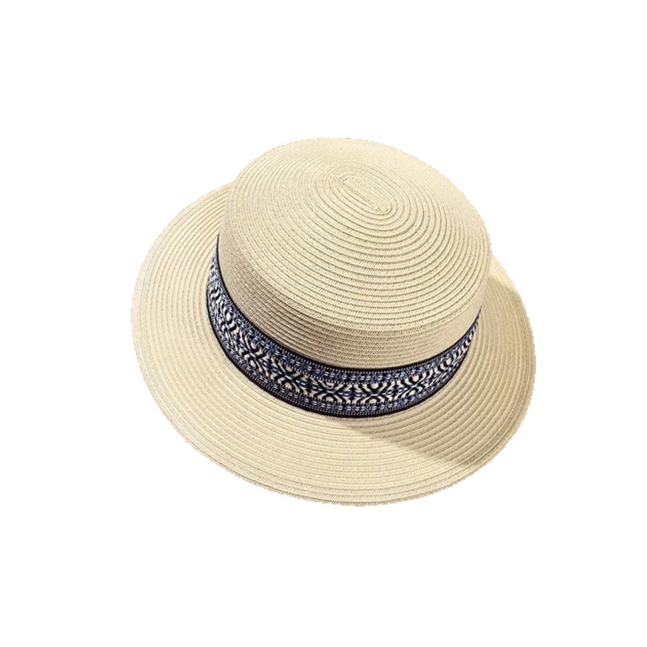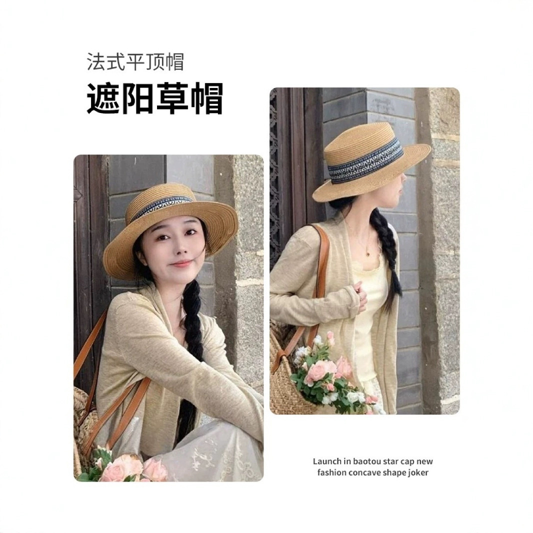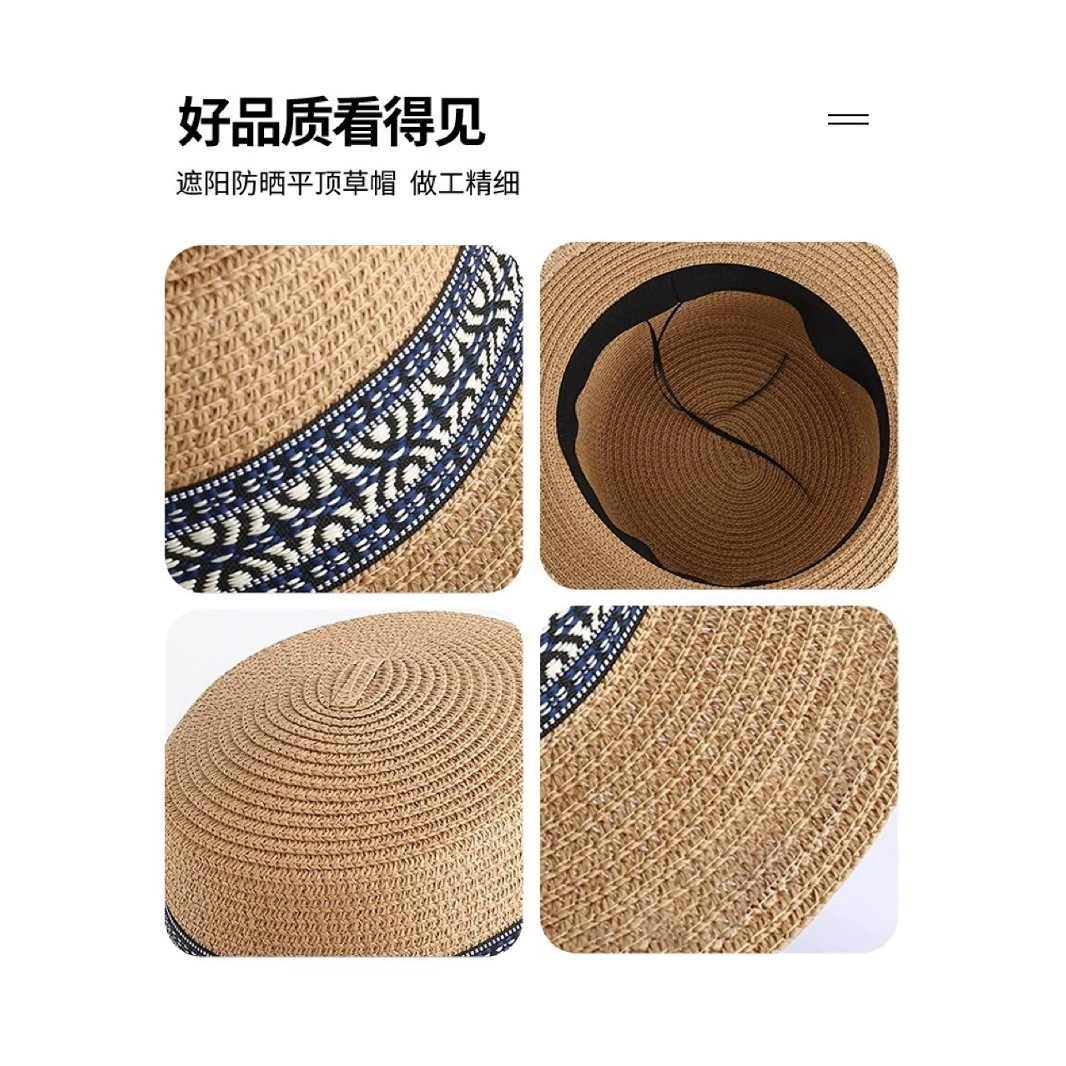 平顶草帽女夏季海边沙滩度假法式复古草编礼帽大头围户外防晒帽子